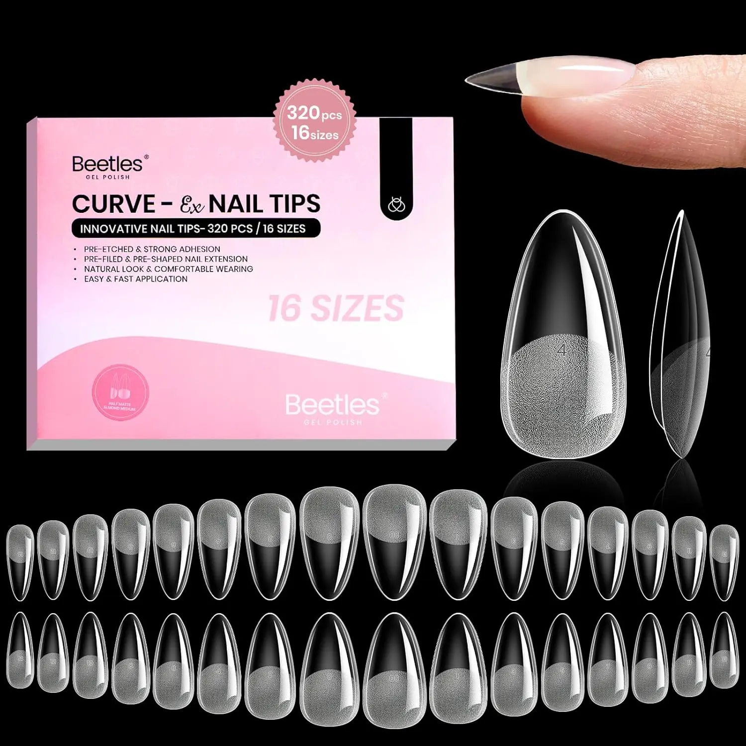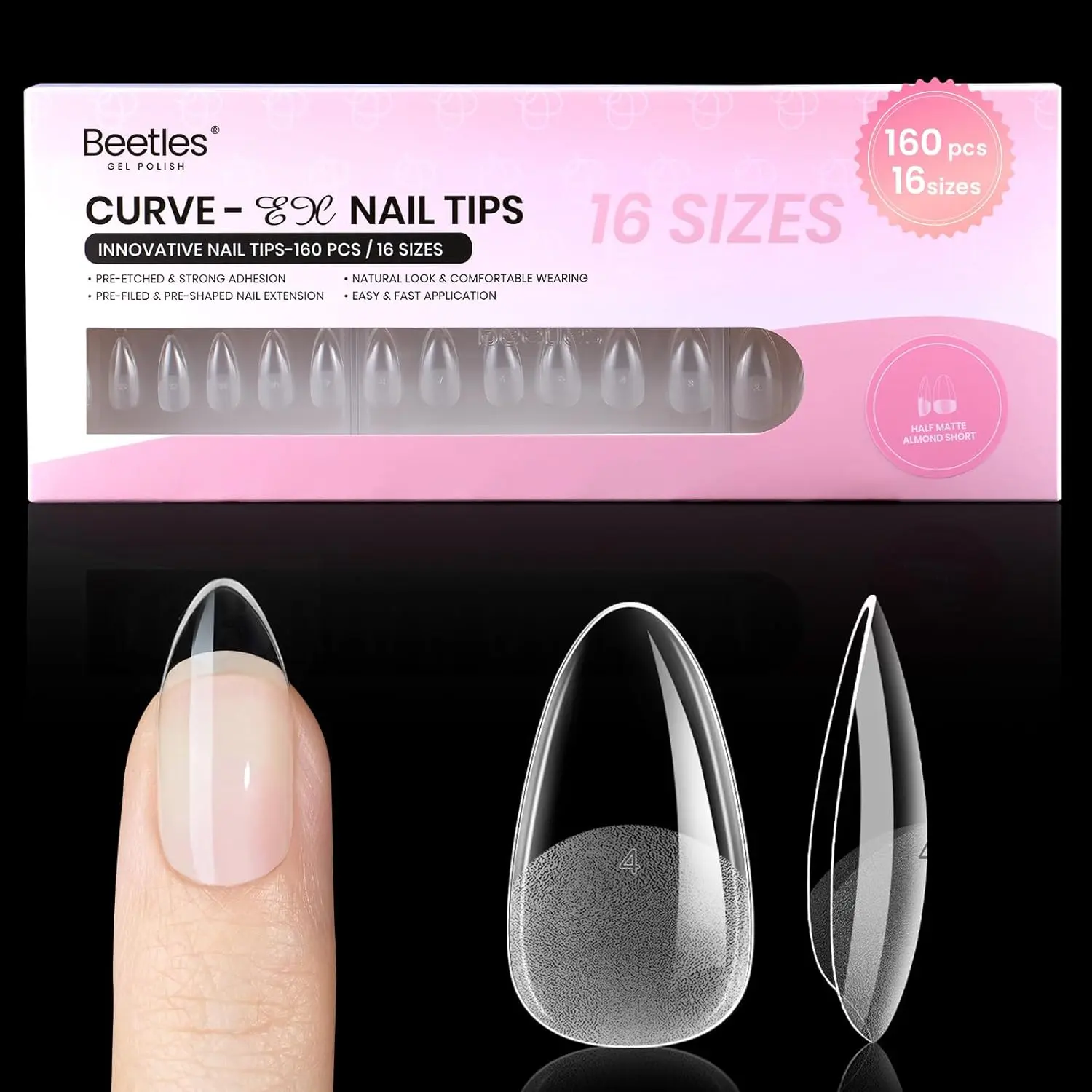 ·Beetles Curve-EX Almond Nail Tips: Beetles Curve-EX tips feature an enhanced arch for superior pressure resistance and durability. This design eliminates gaps and lifting for a remarkably secure, comfortable, and long-lasting wear - ideal for extensions and thick styles on all nail types. Perfect for curved and natural nail beds