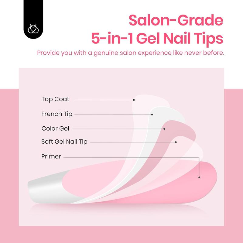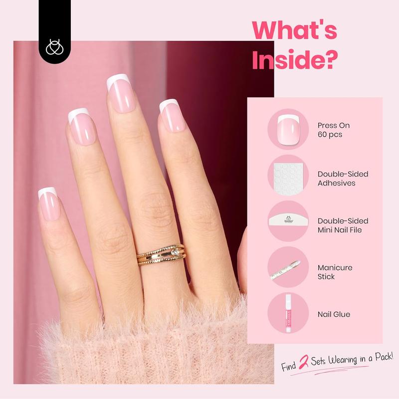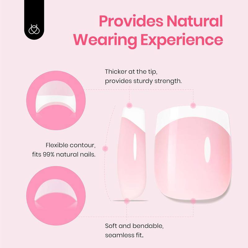 ·Upgrade 5-In-1 Press On Nails: Beetles 5-in-1 pink french tip short square press on nails are made with primer, soft gel nail tips, color gel, french tip and top coat. The top coat provides ultra-protection for french tips, and we thicken the front edge of the new french tips press on nails, which is tough and not easy to break. With proper use, it can be maintained for 28+days.
