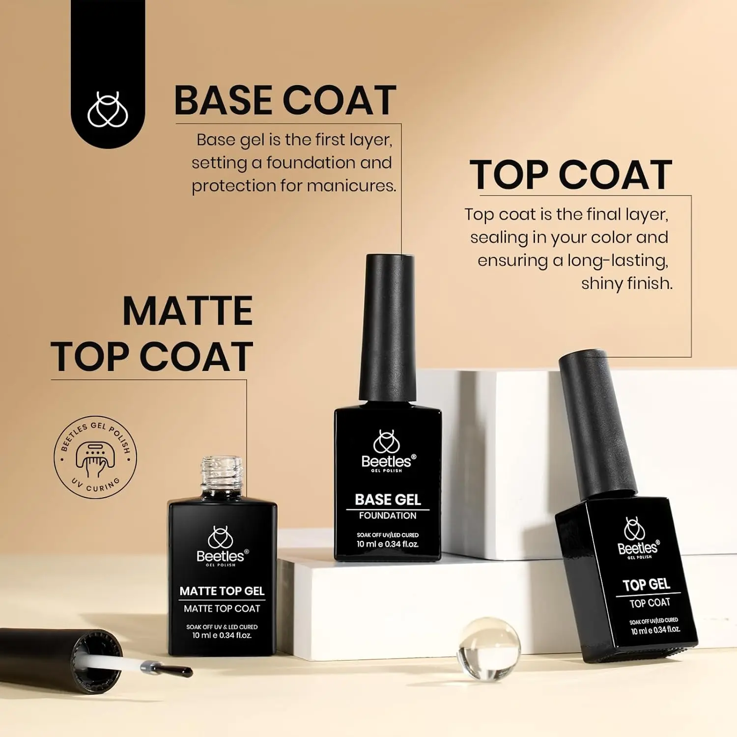·Beetles No Wipe Top Coat and Base Coat: Enjoy long-lasting wear for over 28 days with a perfect shine. The flexible top coat prevents nicks, chips, and smudges. Tip: This Gel Top Coat and Base Coat Set inclue Matte top coat & Glossy top coat. Different Top Coat Effect, the matte or glossy effect of the nail surface is entirely up to you.
