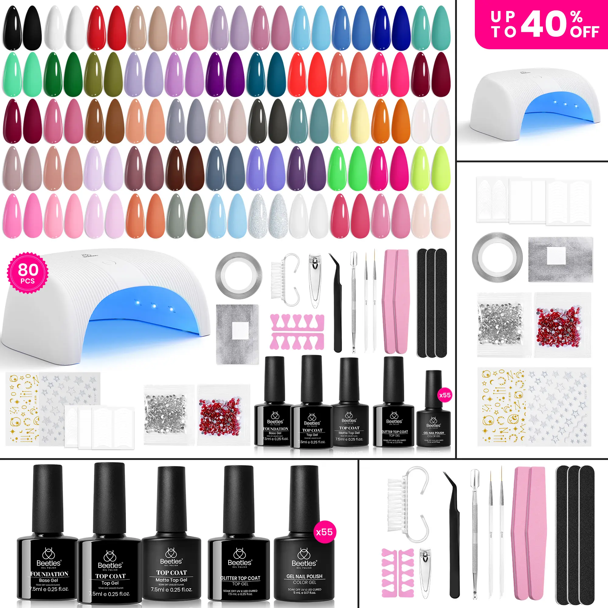 ·【55 Colors Seasonal Symphony】This is a complete gel nail polish kit. It includes 55 bottles of Four Seasons gel nail polish, 2 bottles of base coat, 1 bottle of no wipe top coat, a matte top coat, 1 bottle of glitter top coat, 1 cuticle oil, 1cuticle solvent, a professional nail lamp, 2 diamond decorations, 2 nail sticker, 3 french stickers, and 15 pcs nail tools. The nail set has all the colors you need, accessories, and decorations.