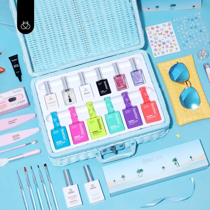 Dive into the Beetles Summer Pretty Box, featuring a colorful gel collection of 15ml6 colors. This set includes 15ml2 base and top coats, 7.5ml1 glitter top coat, and 1*3-In-1 nail glue. Perfect for creating stunning nail art designs. The kit also comes with a nail lamp, 7.5ml2 nail polish, and a 2-In-1 base top coat.
