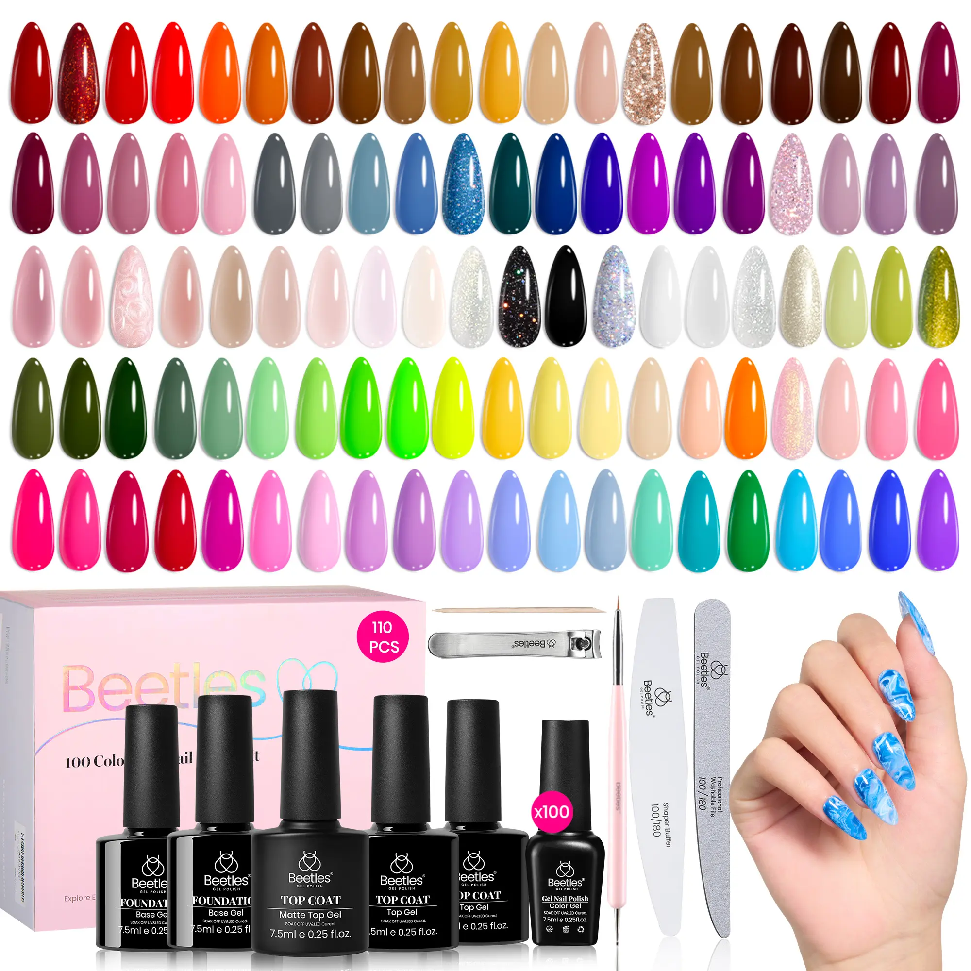 ·【100 Colors Set-A】: Package Includes 100 Colors Gel Nail Polish (5ml each bottle) + Base Gel 7.5ml X 2+Top Coat 7.5ml X 2+ Matte Top Coat 7.5ml X1+Nail File X 1+ Shaper Nail Buffer X 1+Cuticle Stick X 1+Instruction Manual X1+ Bead drawing pen X1.