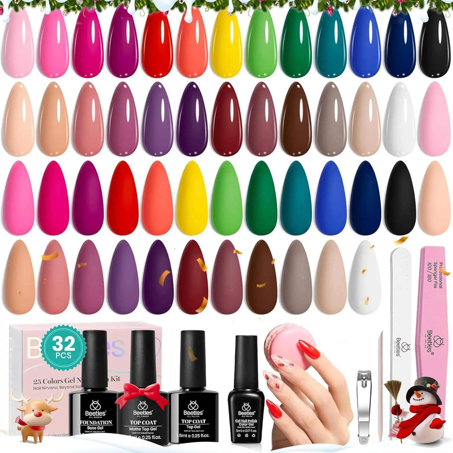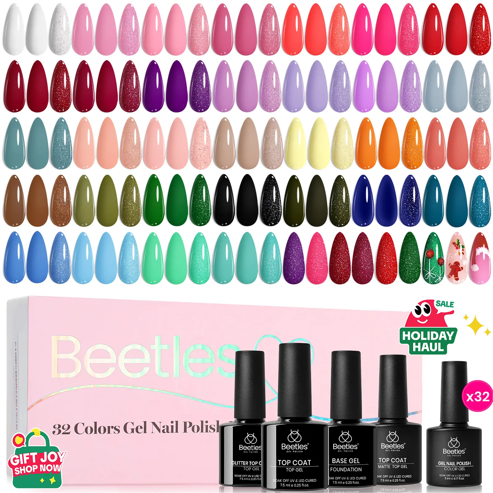 【32 Colors Fingertip Canvas】:32 Colors Gel Nail Kit:These Beetles gel nail polish set including 32 classic and fashionable colors gel , 1 x base coat, 1 x glossy top coat, 1 x matte top coat, 1 x glitter top coat, 1 x random sticker. These gel polish colors are designed to make a statement and leave a lasting impression.