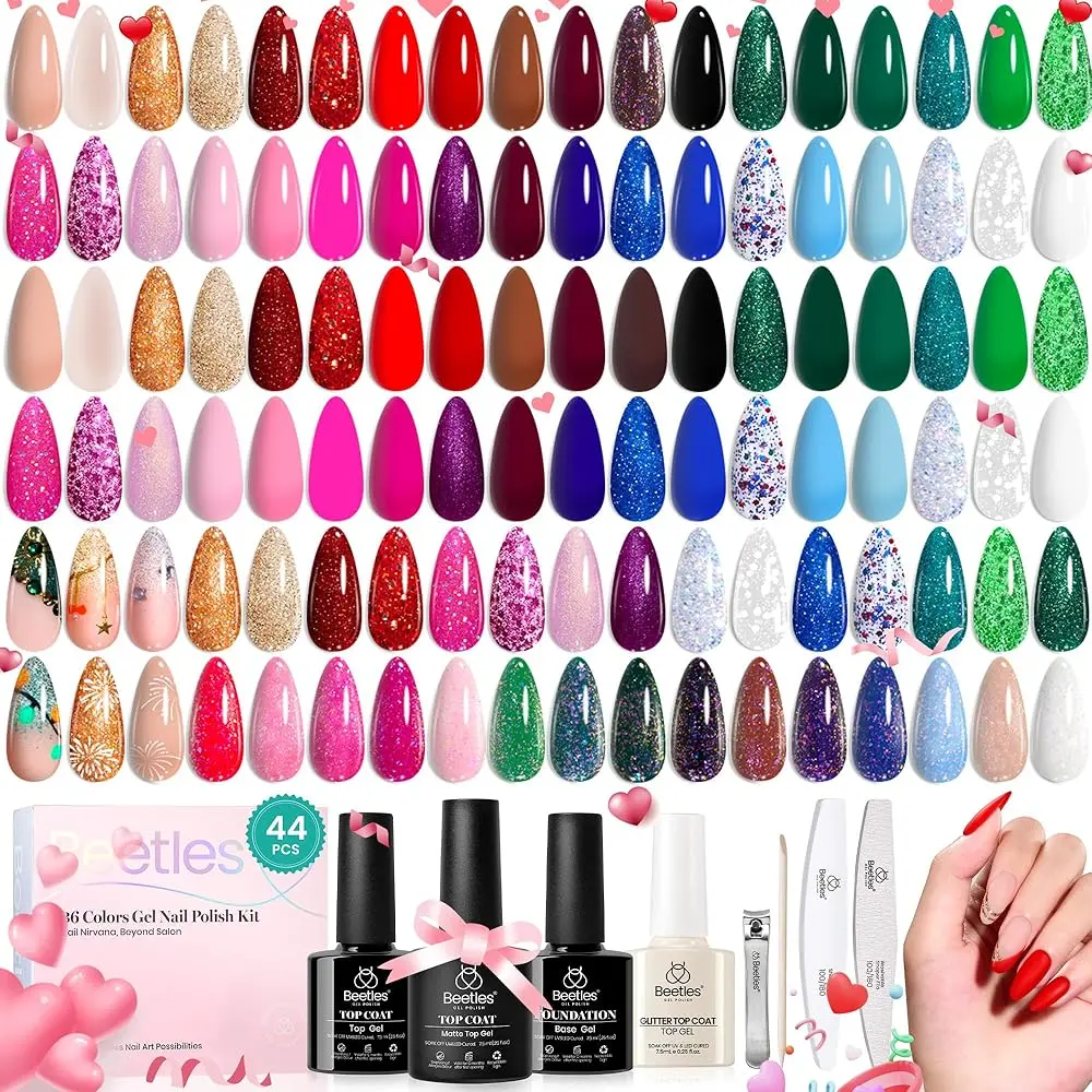 【Christmas Palette】: 5ml Gel Polish*36,7.5ml Base Coat *1,7.5ml Glossy Top Coat *1,7.5ml Matte Top Coat *1,7.5ml Pearlescent Top Coat *1,Nail Buffer *1,Nail File *1,Nail Clipper *1,Cuticle Sticker *1,Instruction Manual *1. Beetles provides you with all the colors you need for winter DIY nails, so you won’t have to worry about choosing the right colors with this gel polish set.