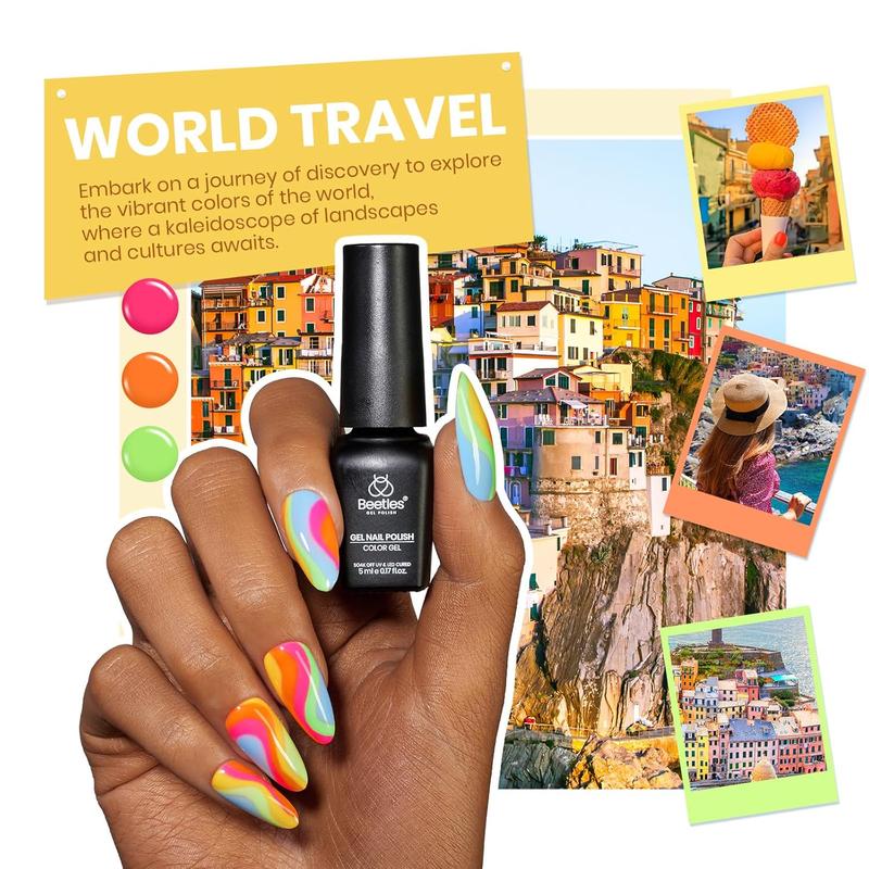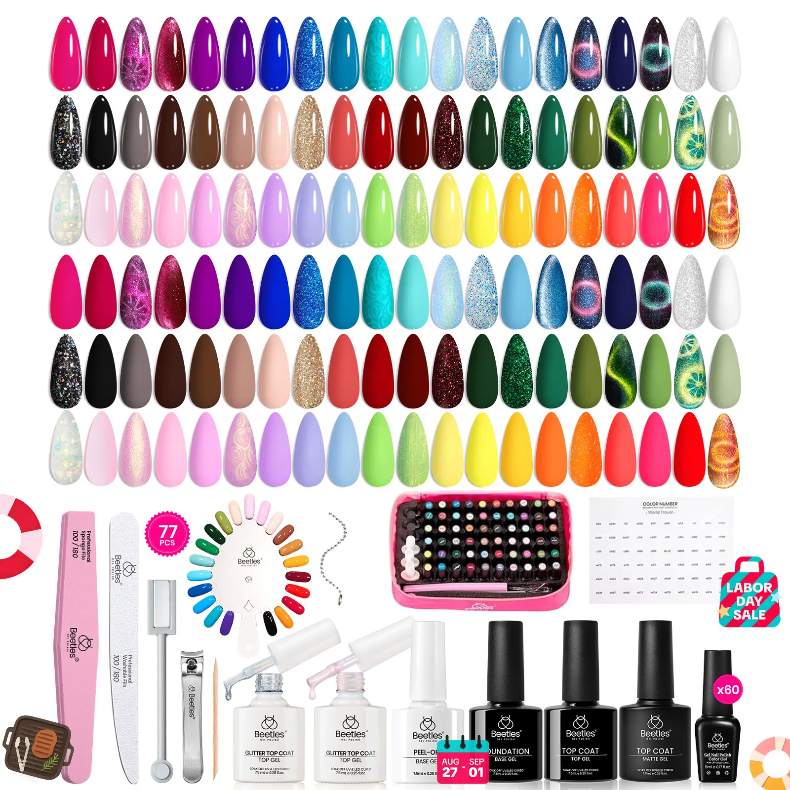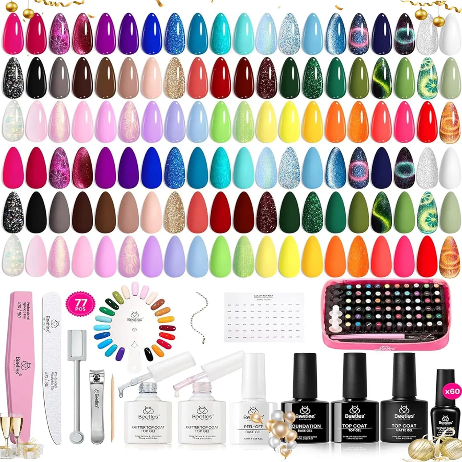 ·【60 colors World Travel】:Beetles 60 Colors Gel Polish Set: With the beetles gel nail kit, you get 60 classic and fashionable colors , 1 x 7.5ml gel base coat and glossy & matte Top Coat, 1× peel off base coat, 2×glitter top coat,1 x Nail Buffer , 1 x Curved Nail File, 1 x Nail Clipper, 3xColor palette, 1 x Color number sticker, 1 x Cuticle Stick, with all in one storage bag, which isasy to store, no mess! Whether it's a casual day, a gathering with friends or a ceremonial event, these beetle gel nail polish colors can match any look you wear.