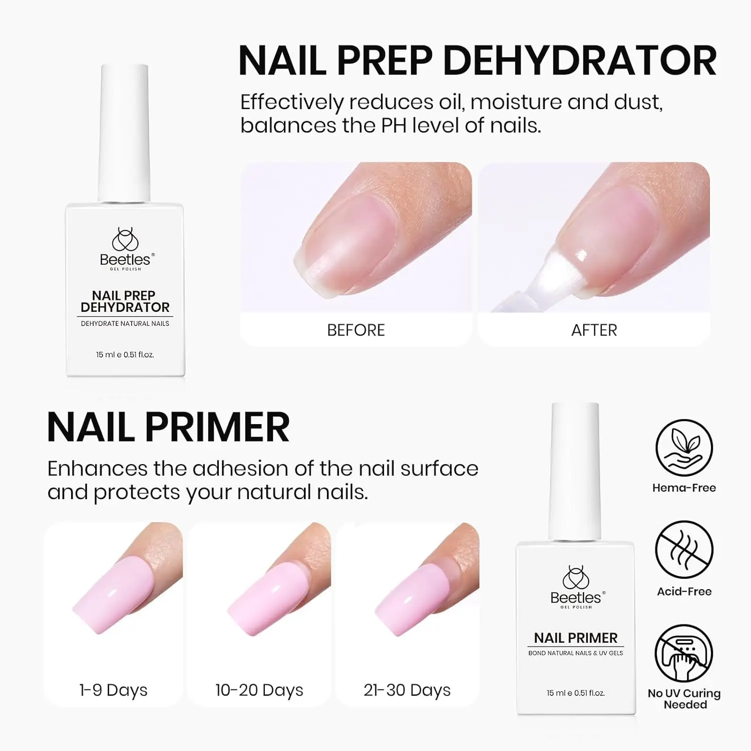 ·【Warm Note】: Beetles nail dehydrator and primer,gel base and top Coat set is professionally formulated for nail use only. Avoid contact with eyes and mouth. In case of contact, rinse with water immediately. If you feel unwell, discontinue use and seek medical attention. If you have any questions about the product, please do not hesitate to contact us.