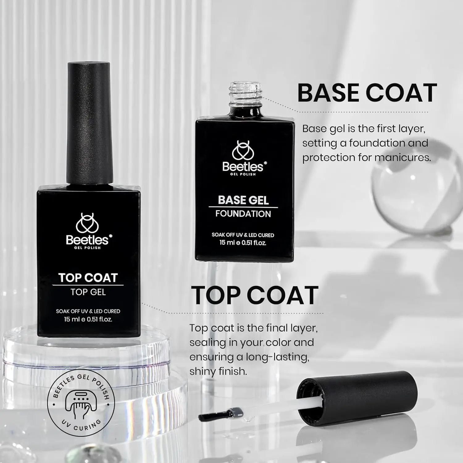 · Beetles No Wipe Top Coat and Base Coat: Enjoy long-lasting wear for over 28 days with a perfect shine. The flexible top coat prevents nicks, chips, and smudges. Tip: The base coat is designed to remain sticky, providing a solid foundation for the next coat of polish.
