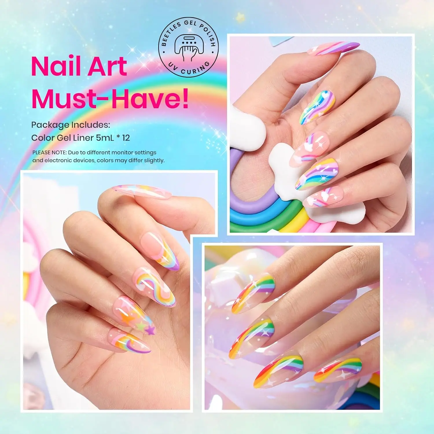 ·Beetles Rainbow Gel Art Set: Perfect for those trendy squiggly lines abstract paintings that are so popular now, also works perfectly for adding a French line! With the built-in thin brushes, you don't have to get out your set of brushes for adding details and lines. Color Numbers are: b475-b476-b477-b478-b479-b480-b481-b482-b483-b484-b485-b486.