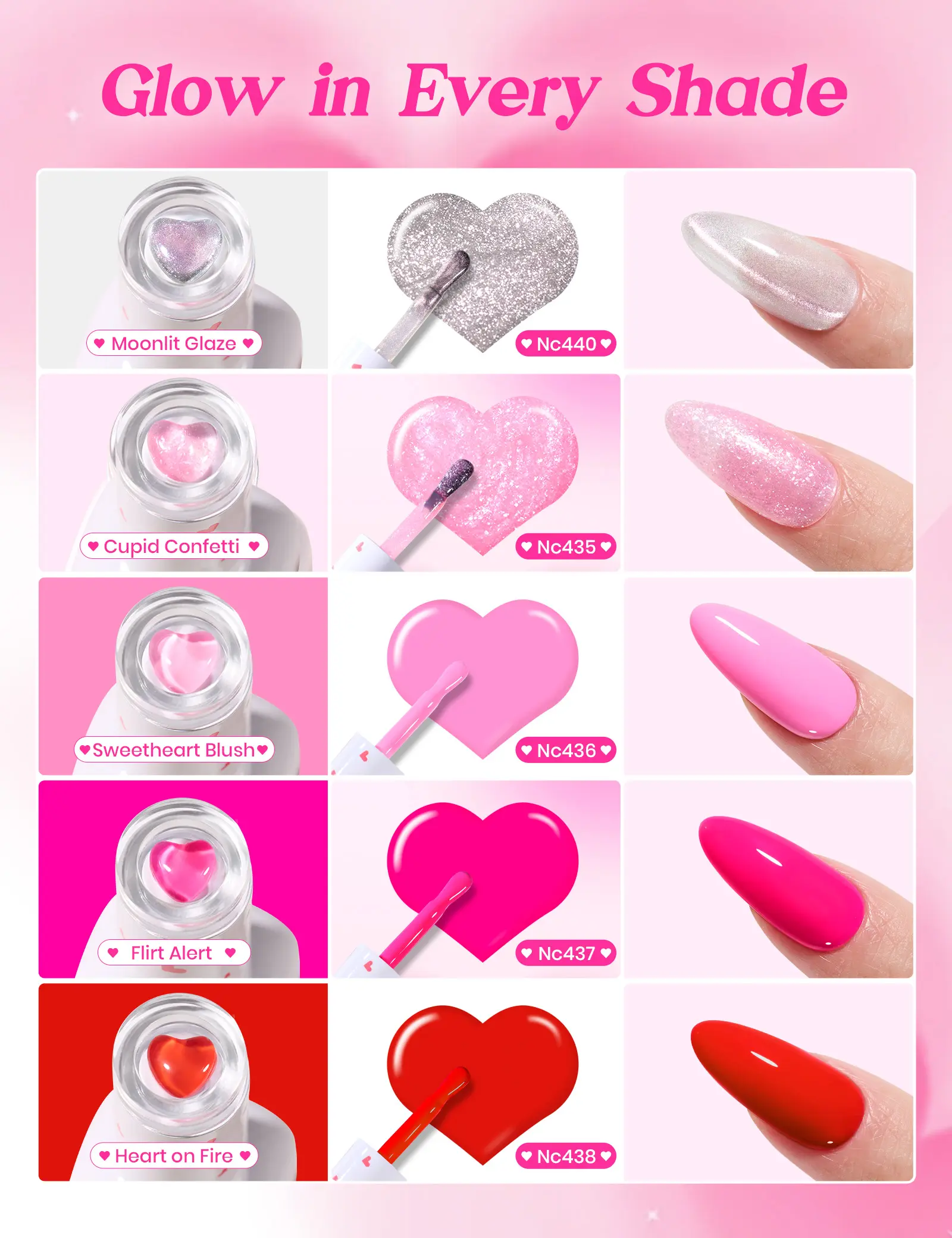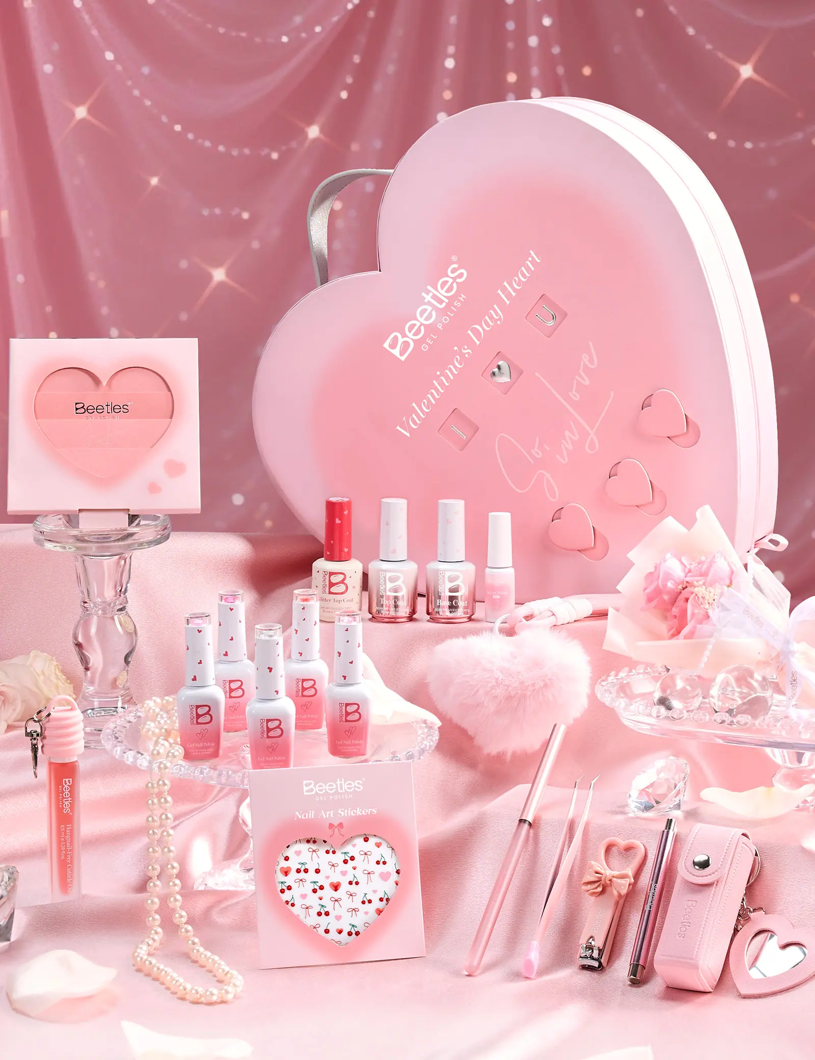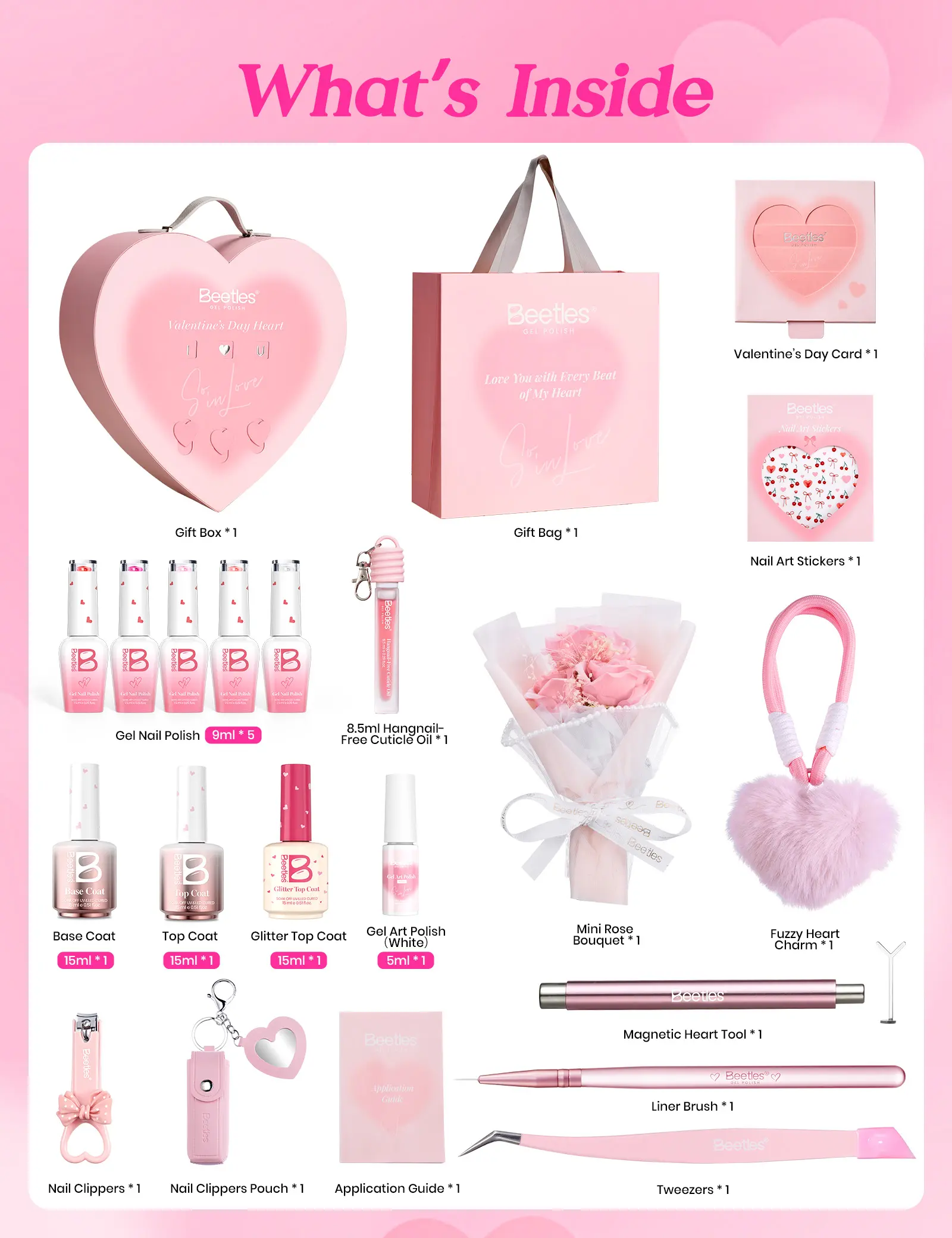 Glow In Love:15ml Base Coat * 1, 15ml Top Coat * 1, 15ml Glitter Top Coat * 1, 5ml Liner Gel * 1, 9ml Color Gel * 5, 8.5ml Cuticle Oil (Rose Scent) * 1, Tweezers * 1, Nail Clippers * 1, Nail Art Brush * 1, Magnet * 1, Heart-shaped Wire * 1, Nail Stickers * 1, Heart-shaped Plush Bag Charm * 1, Nail Clipper Storage Pouch * 1, Valentine's Day Greeting Card * 1, and Preserved Rose * 1.
