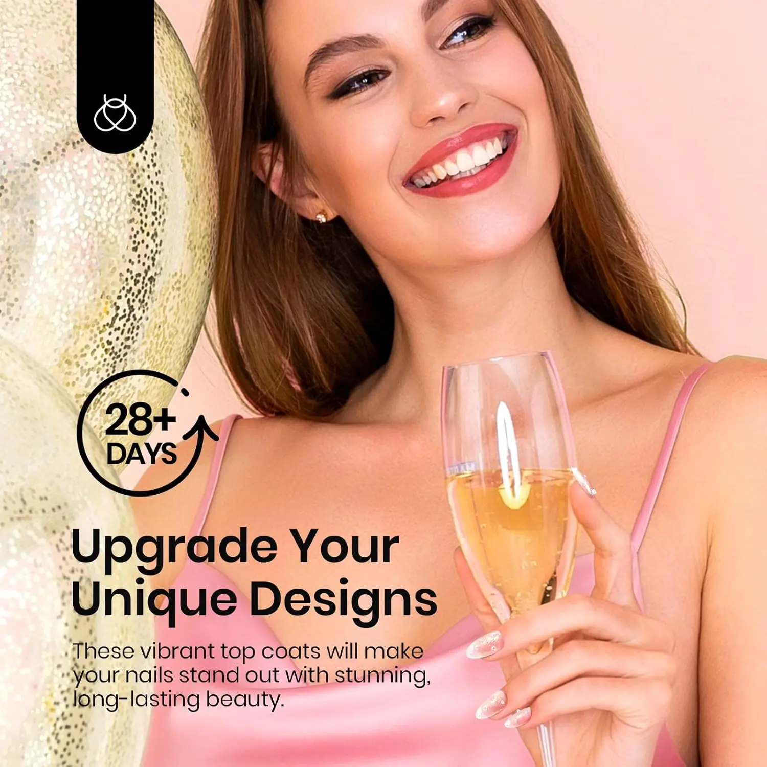【Long Lasting for 28+ Days】Made from a harmless natural resin, the glitter gel top coat is non-toxic and low odor, giving your nails a hard protective layer against cracks and chips on the nails, and can last for more than 28 days.