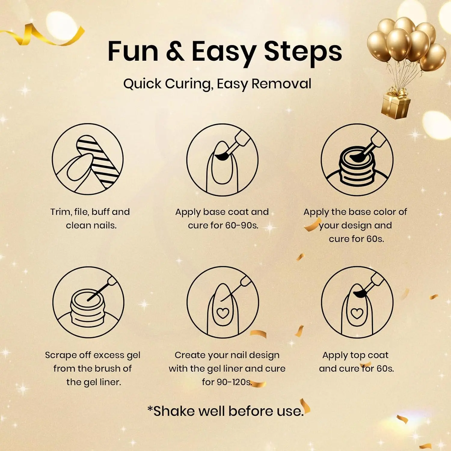 - Application: Requires a base coat and top coat. Average curing time with LED nail lamp is 60-120 seconds.