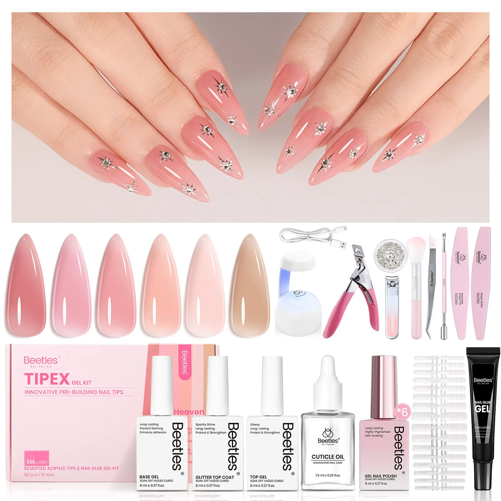 ·Includes: 224 pre-shaped tips, solid UV nail glue (20g), smart mini UV lamp, and nail file.