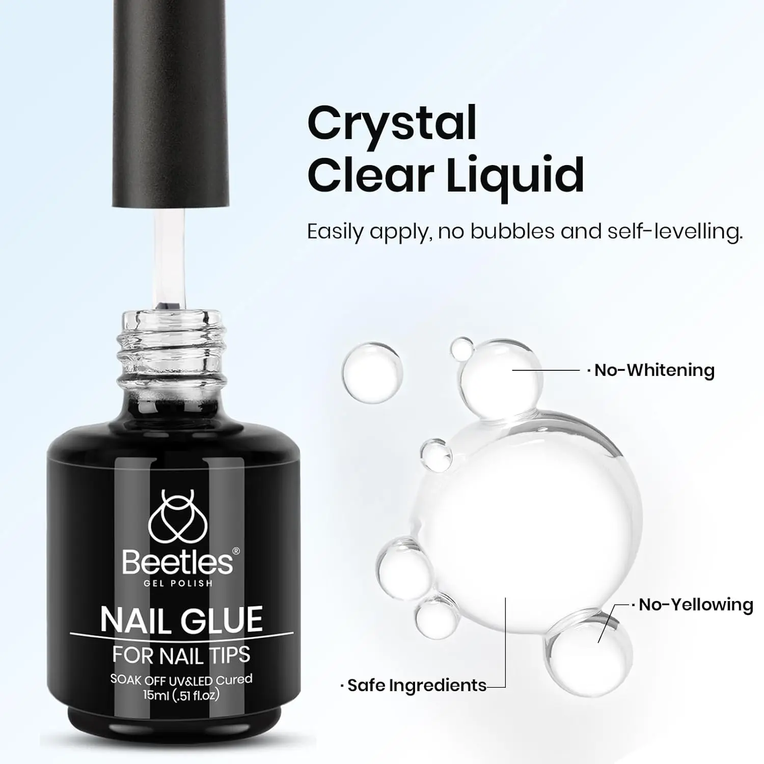 The Beetles Gel Polish Nail Glue Kit includes 2x15ml Nail Glues Gel. It serves as an adhesive, base gel, blooming gel, rhinestone glue, and slip solution. Perfect for DIY nail art, it is ideal for clear nail tips, not solid press-ons. The gel is safe and low-odor, providing a comfortable nail experience. Note: Some may experience allergies.
