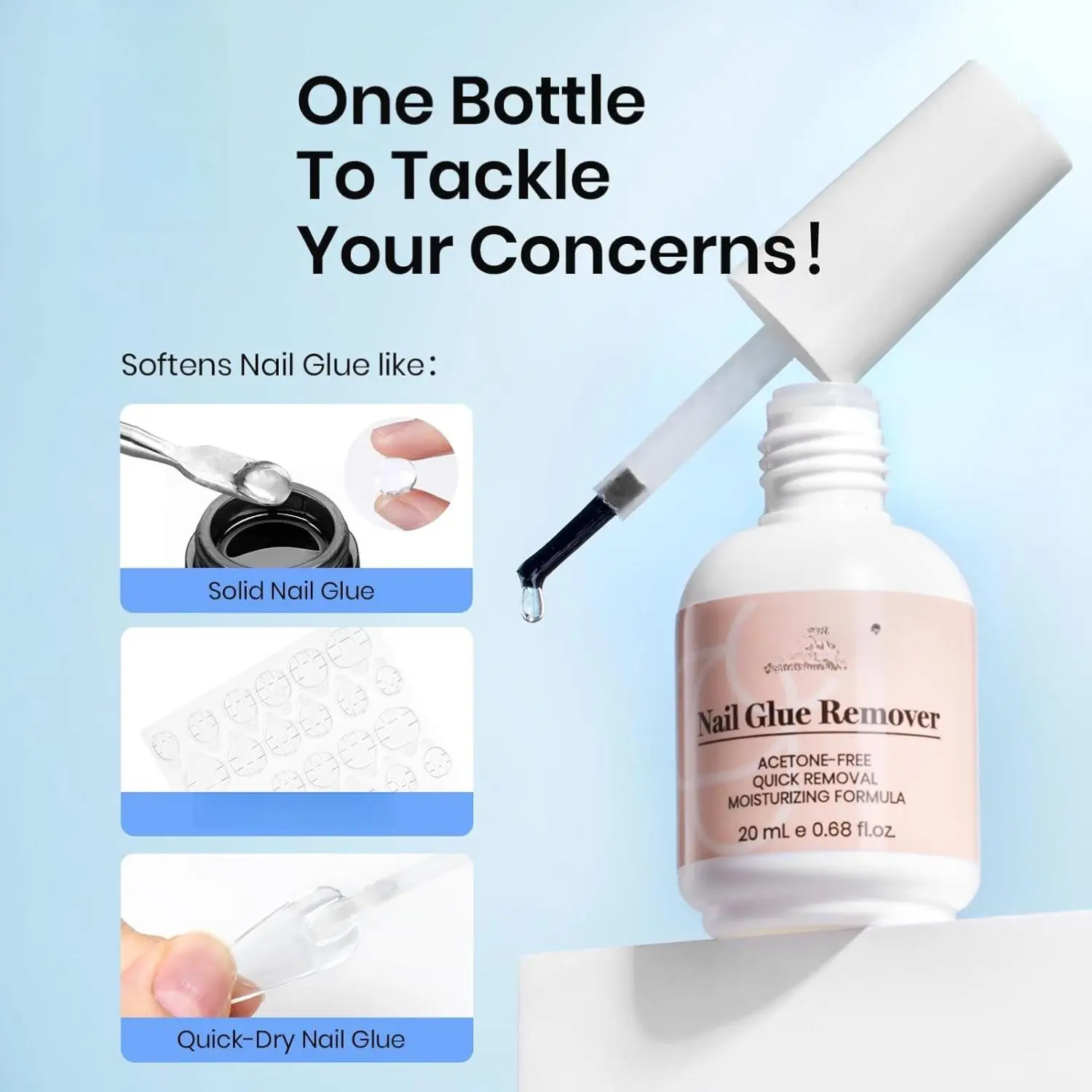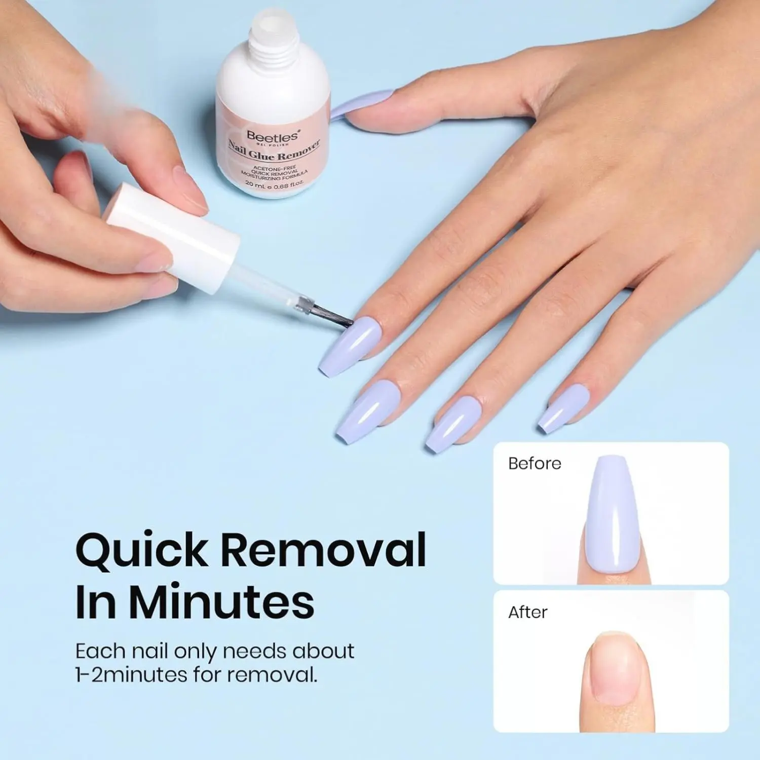 This nail glue remover is exclusively for press-on nails, quick-drying glue, and other glues without an LED lamp. It's not suitable for gel polish. Gentle and low-odor, it ensures a safe removal process. The fine precision brush applicator minimizes nail damage and edge skin irritation.