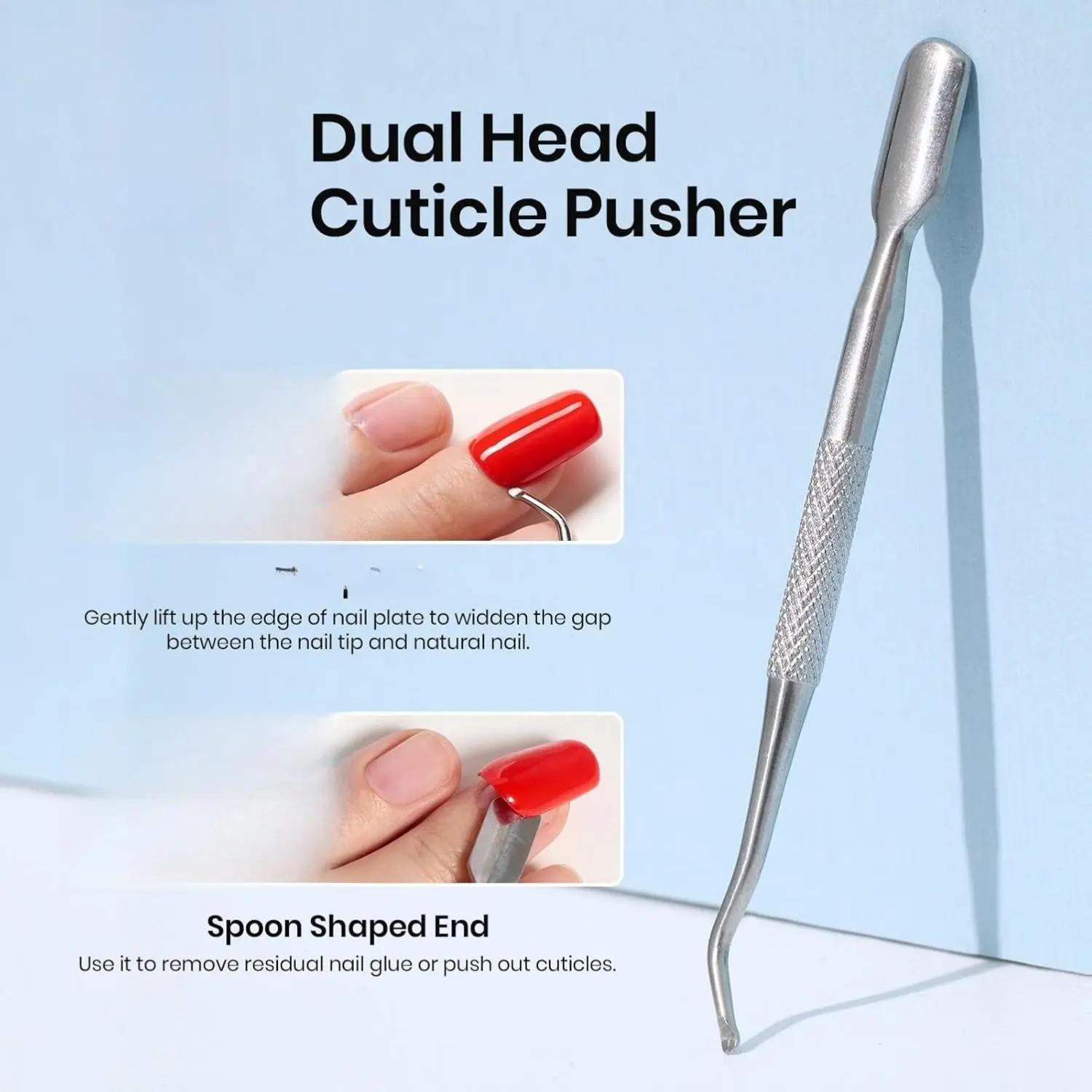 The pointed end inserts into gaps between false and natural nails, while the flat end removes residual glue. It's an essential tool for nail art before and after nail tips removal.
