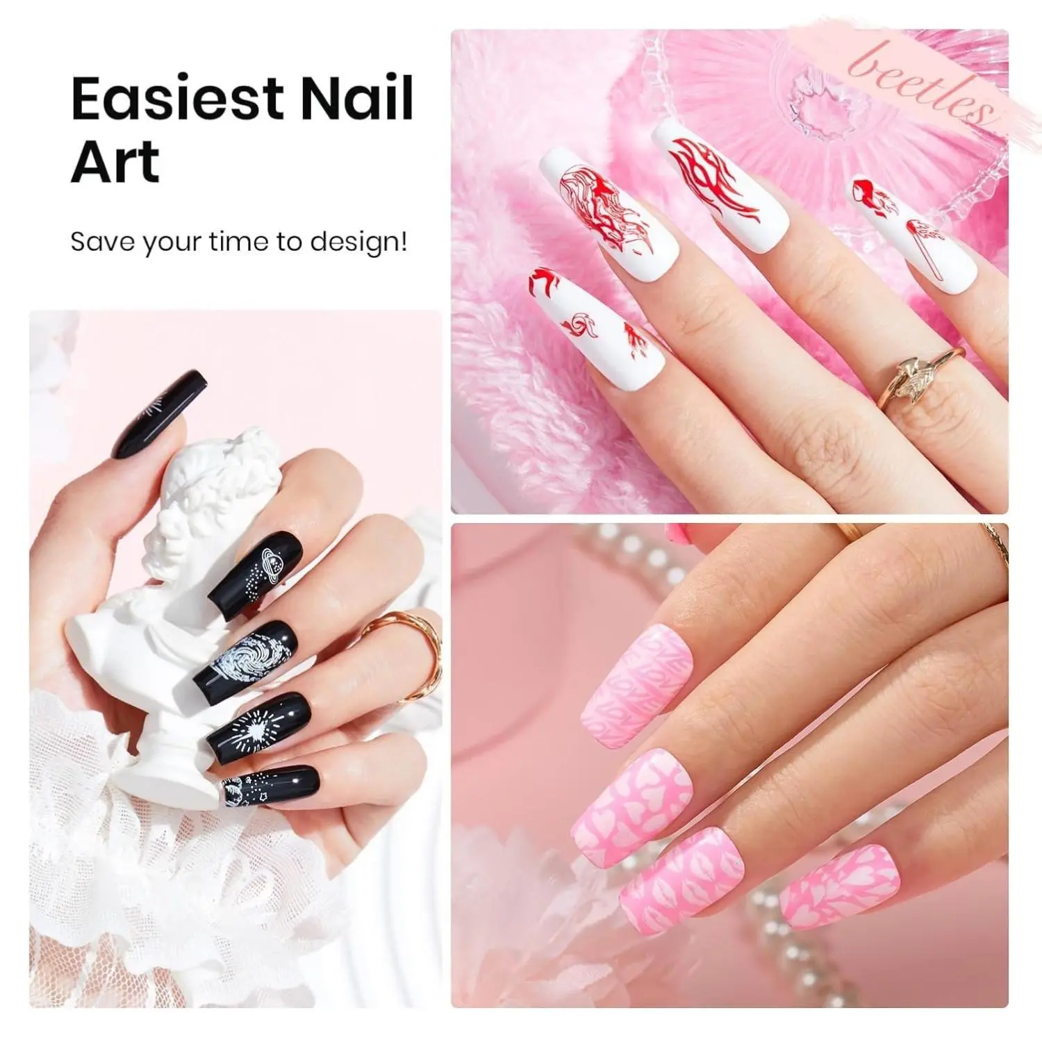 ·Beetles Stamp Gel Set: This nail stamp polish gel kit includes nail stamping polish gel 8g*8, Nail stamping template*5, a scraper ,a liquid peel off latex tape 15ml and a short silicone stamper, which is an ideal choice for both beginners and professional nail designers.