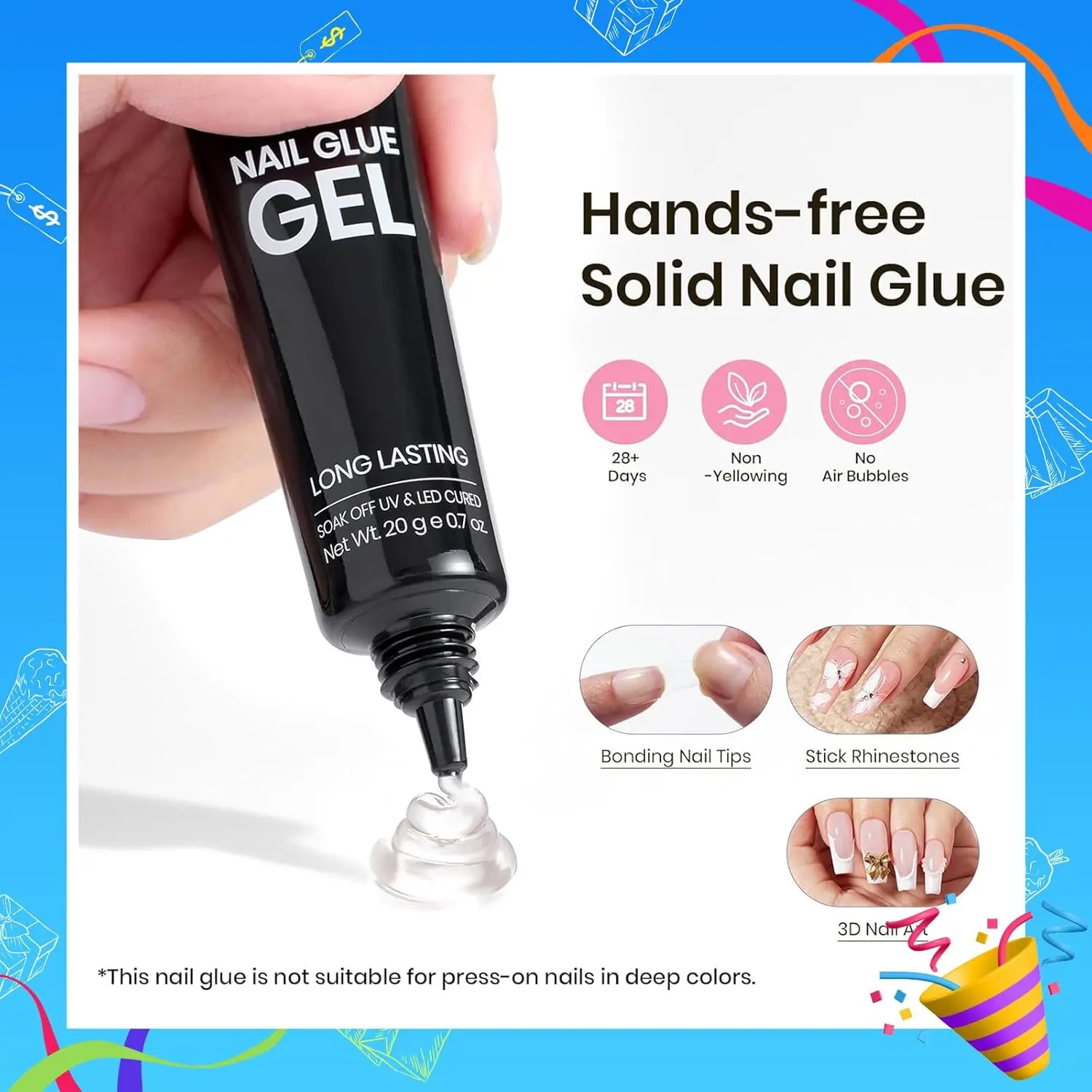 The solid UV nail glue comes in a mess-free squeeze tube. Holds tips in place without pressure while curing. Perfect for beginners and easy application of rhinestones or 3D nail art.