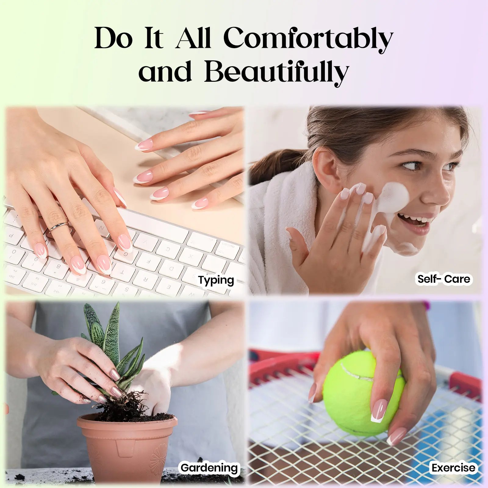 This has everything you need for the perfect nails. Super easy and quick to apply. I love a shorter look so I cut them down. Loving the results! The colors are gorgeous can leave at a matte or use the top coat for a sparkling shine.