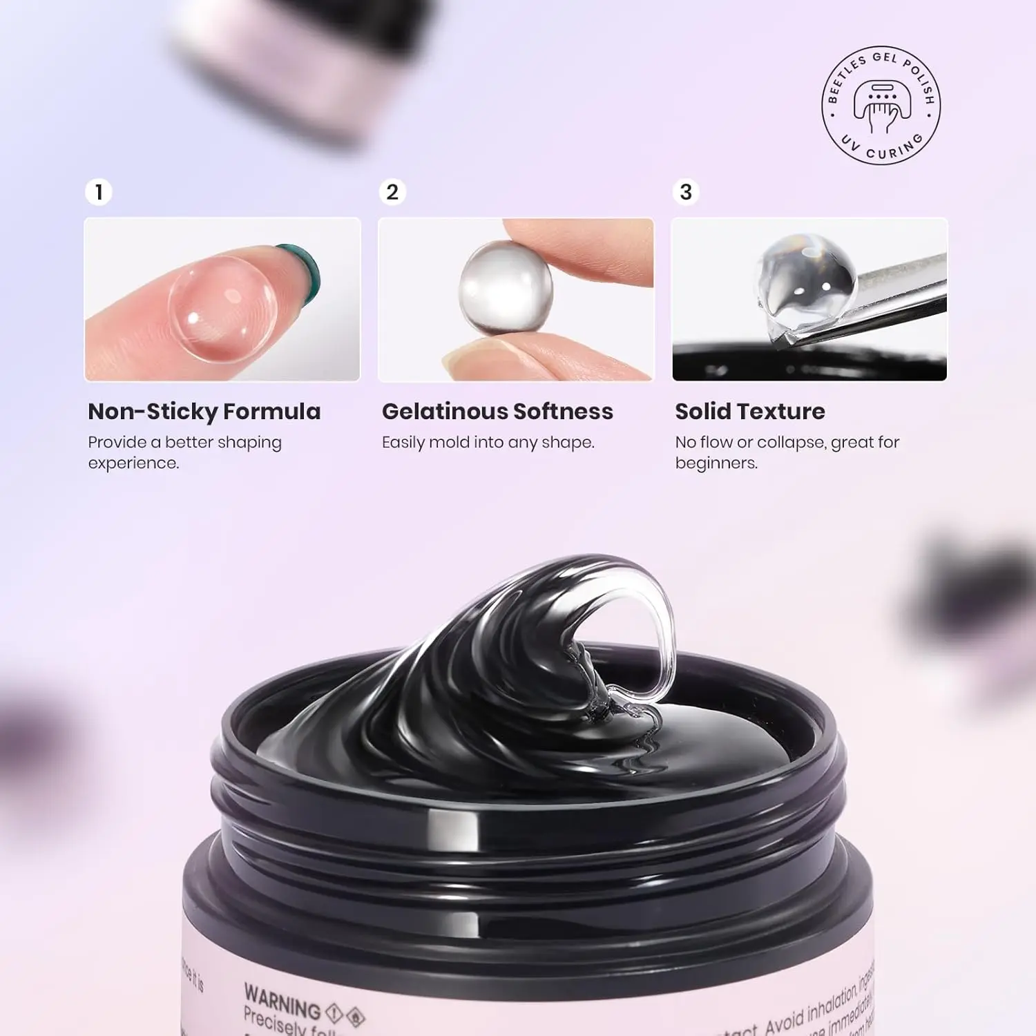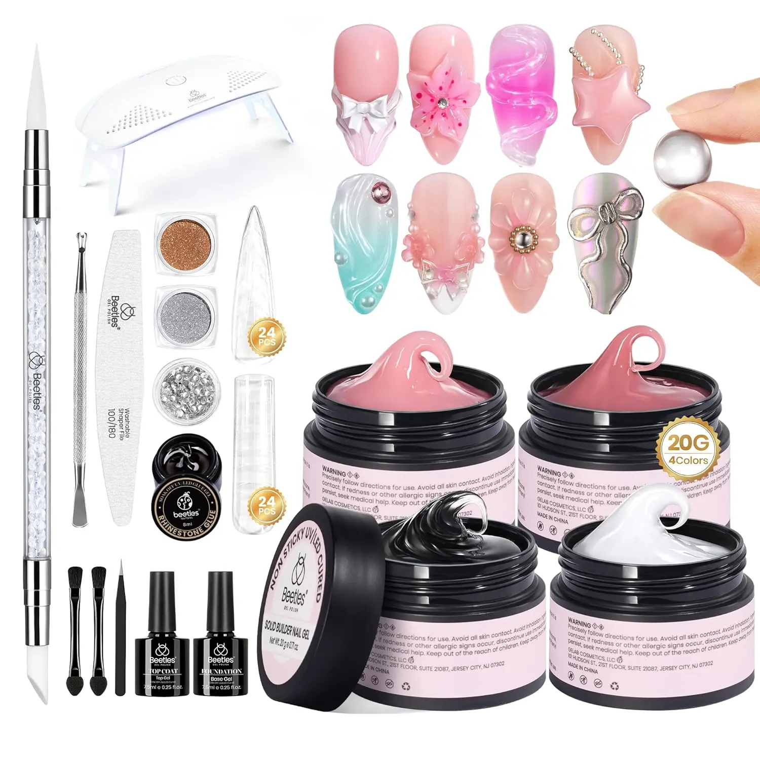 【20g*4 Colors Solid Builder Gel Nail Art Kit】:Beetles new upgraded Solid Builder Gel Kit contains 20g*4 colors hard gel for nails, 8g rhinestone nail glue, 7.5ml*2 base and top coat, 0.5g*2 chrome nail powder, 1*double-head silicone pen for 3D nails, 24*2 pcs nail models, 1*rhinestone nail decoration, 1*nail lamp,1*nail file, 1*cuticle pusher and 1*tweezer. This nail builder gel is solid material, and won't leak everywhere. Friendly for nail art beginners or manicurists to create stunning 3D nail art design.