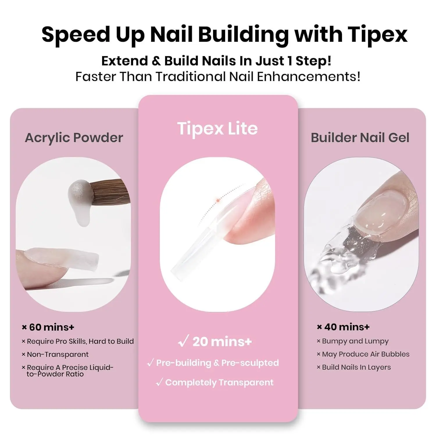 Tired of nail prep? Tipex pre-sculpted, pre-etched, and pre-shaped acrylic nail tips simplify your manicure. They come with a ready-made instant apex and c-curve, eliminating tedious layering, filing, and shaping. Speed up your process with a nail drill and save time!