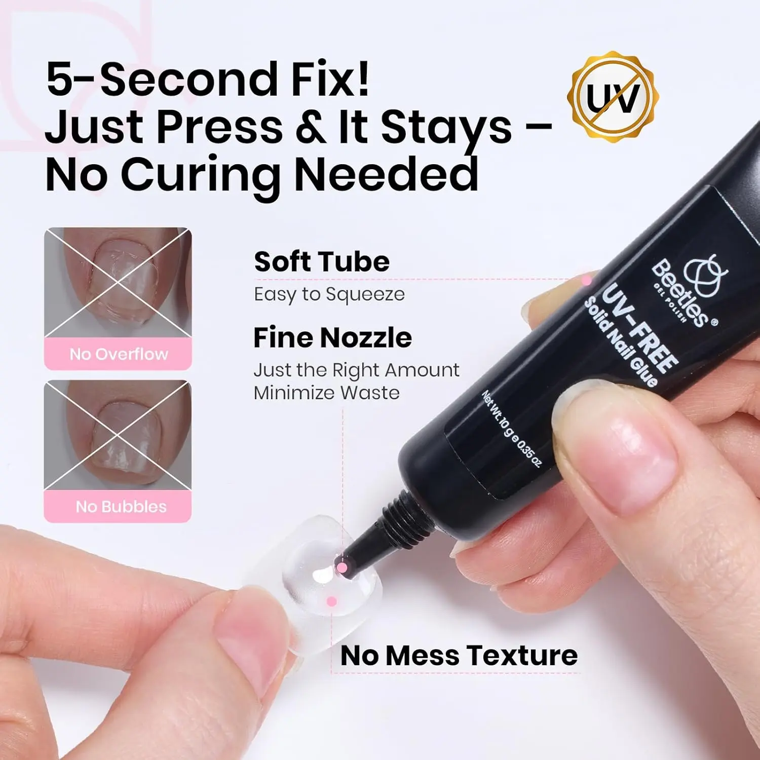 ·Uv-Free Solid Nail Glue: This semi-solid glue No Uv Light Needed 5 second quick set ensures that press on nails, while not easy to flow, easier to control the amount, even if you are a DIY nail art beginners can also be easily managed!