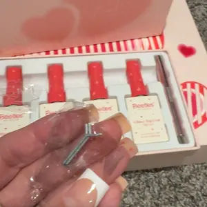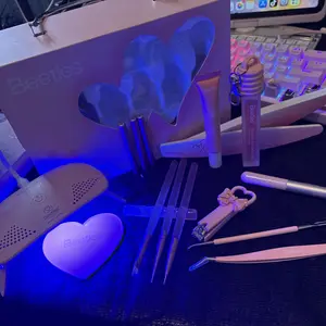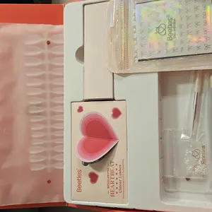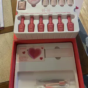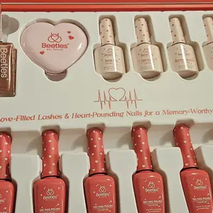 【HEARTBEAT Nail Kit】:9ml Colored Gel *6、7.5ml Base Gel *1、7.5ml Top Coat *1、7.5ml Heart-Shaped Top Coat *1、7.5ml Nail Glue *1、15ml Nail Polish *1、Mixed Small Pearls *1、Transparent Heart-Shaped Accessories *1、3D Heart-Shaped Accessories + Bow Accessories *1、Heart-Shaped Stickers *1、Bow Stickers *1、Heart-Shaped Hollow Stickers *1、Dotting Tool *1、Tweezers *1、Medium Almond Shape Nail Tips 12 sizes *5 (150pcs)、Nail Palette *1、Nail Stands *5、Heart-Shaped Mirror *1、Eyelashes (including Tweezers) *1、Universal Instruction Manual *1.