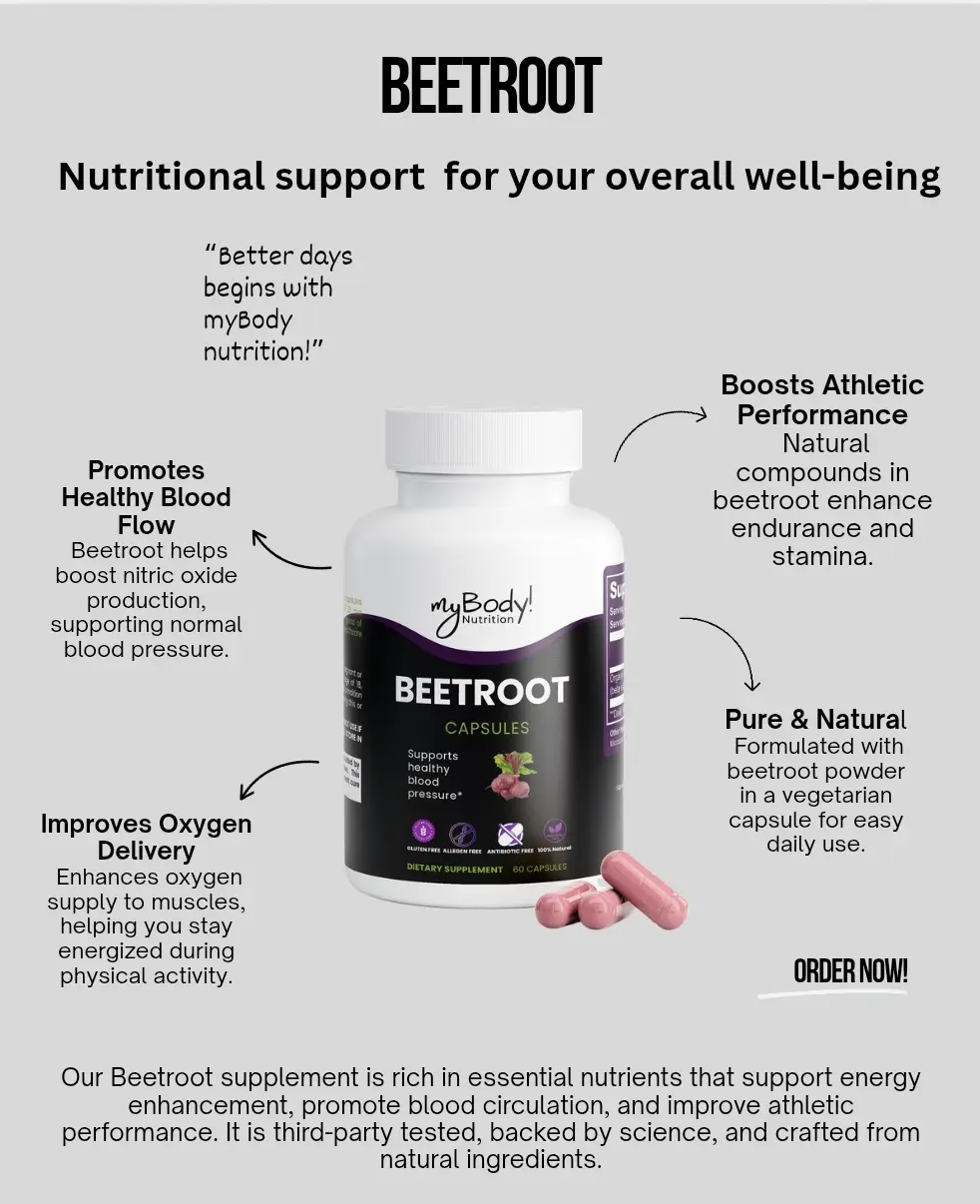 Beetroot Capsules are a simple, plant-based way to support healthy blood flow and circulation. Beetroot naturally supportsnitricoxide levels, which play a key role in normal blood flow and oxygen delivery.