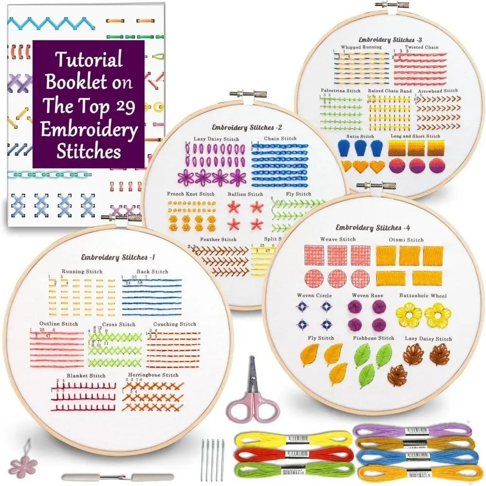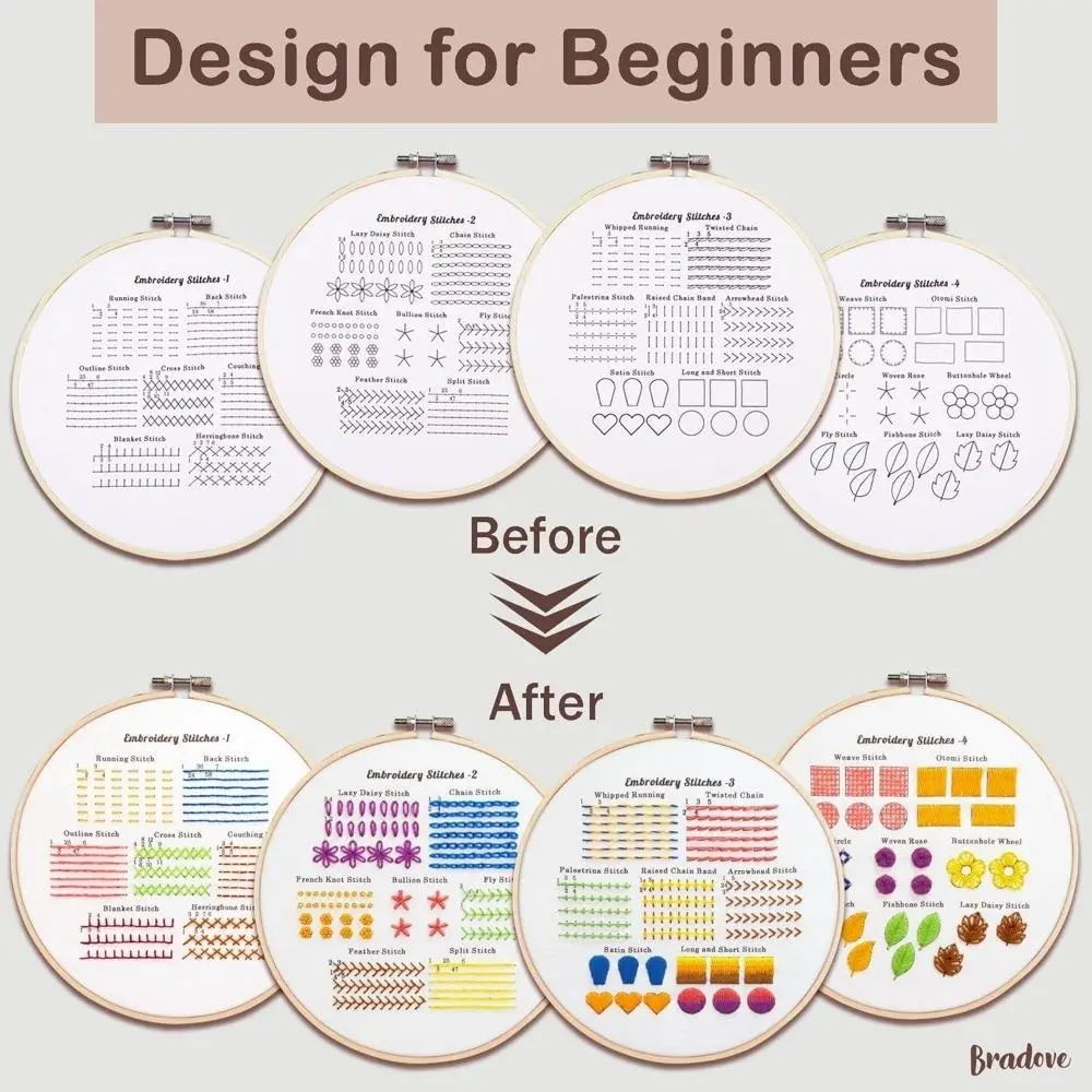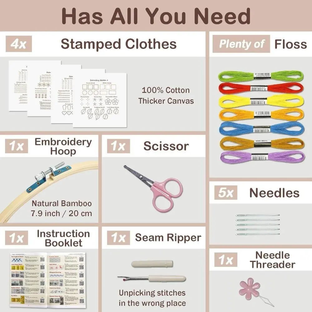 ·【Has All That You Need】Our embroidery starter kit includes everything you need to kickstart your embroidery journey. From high-quality threads to premium fabric with patterns, needles, scissor, threader, seam ripper, and embroidery hoop