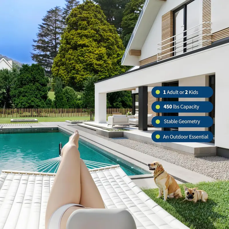 【Spacious 2-Person Size for Shared Relaxation】78.7”L x 55.1”W bed with integrated head pillow offers ample room for two adults or one adult + kids/pets. 450 lbs weight capacity with even force distribution ensures no crowding—perfect for cozy outdoor rest. 【Comfort & Breathability】Premium poly-cotton fabric combines polyester’s durability with cotton’s softness: breathable, skin-friendly, and moisture-wicking. Built-in polyethylene pillow adds neck support, ideal for long naps or reading without stuffiness. 【Stable & Safe Design】Marine-varnished spreader bar keeps the hammock flat; balance ropes prevent tipping. 18-strand hand-woven poly-cotton ropes + O-steel rings enhance tensile strength—safe for all ages, no flipping or fraying. 【Tool-Free Assembly & Portable Storage 】12ft powder-coated steel stand (rust-resistant) assembles in 5 minutes with spring buckles (no tools). Disassembles easily and fits into a 48.8” carry bag (7.9” thick)—perfect for camping, beaches, or backyard use. 【Durable & UV-Resistant】Poly-cotton blend resists fading (UV-protected) and wear; double-layer stitching reinforces durability. 1-year warranty + strict quality checks ensure reliable use for years of outdoor leisure.