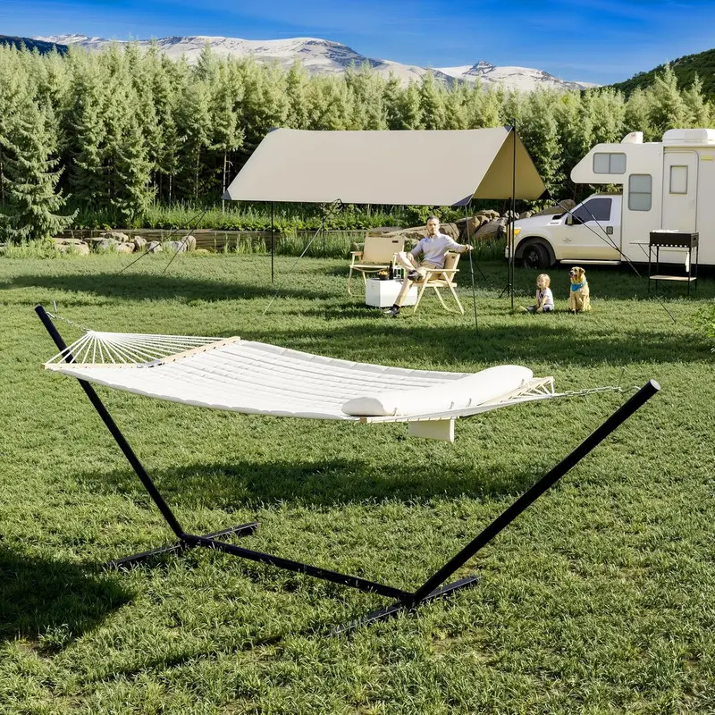 5. Beige Hammock with Stand, Heavy Duty Portable Steel Frame Hammocks with Quilted Fabric, Outdoor Patio/Camping Hammock with Pillow and Carrying Bag