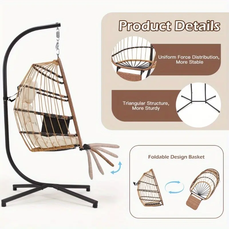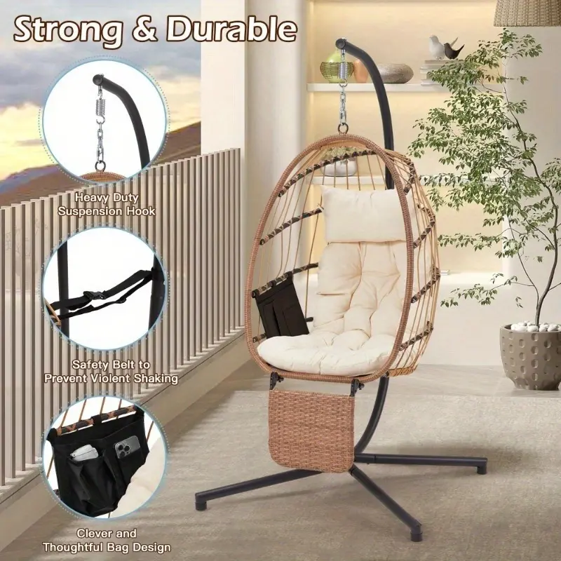 Built for durability, the foldable wicker rattan hanging egg chair with stand features a powder-coated carbon steel frame and UV-resistant, weather-resistant materials, making it suitable for year-round use. It’s also a modern, chic addition to any room or outdoor space, and its foldable design and detachable leg rest make it easy to assemble, disassemble, and store.