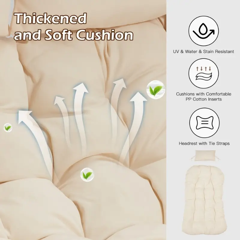 Featuring a comfortable Beige cushion and a soft headrest pillow, this Swing Chair with Cushion and Pillow provides a comfy place to read, relax, or work. The additional leg rest adds extra comfort and support, ensuring a cozy experience whether you're lounging indoors or basking in the sun outside.