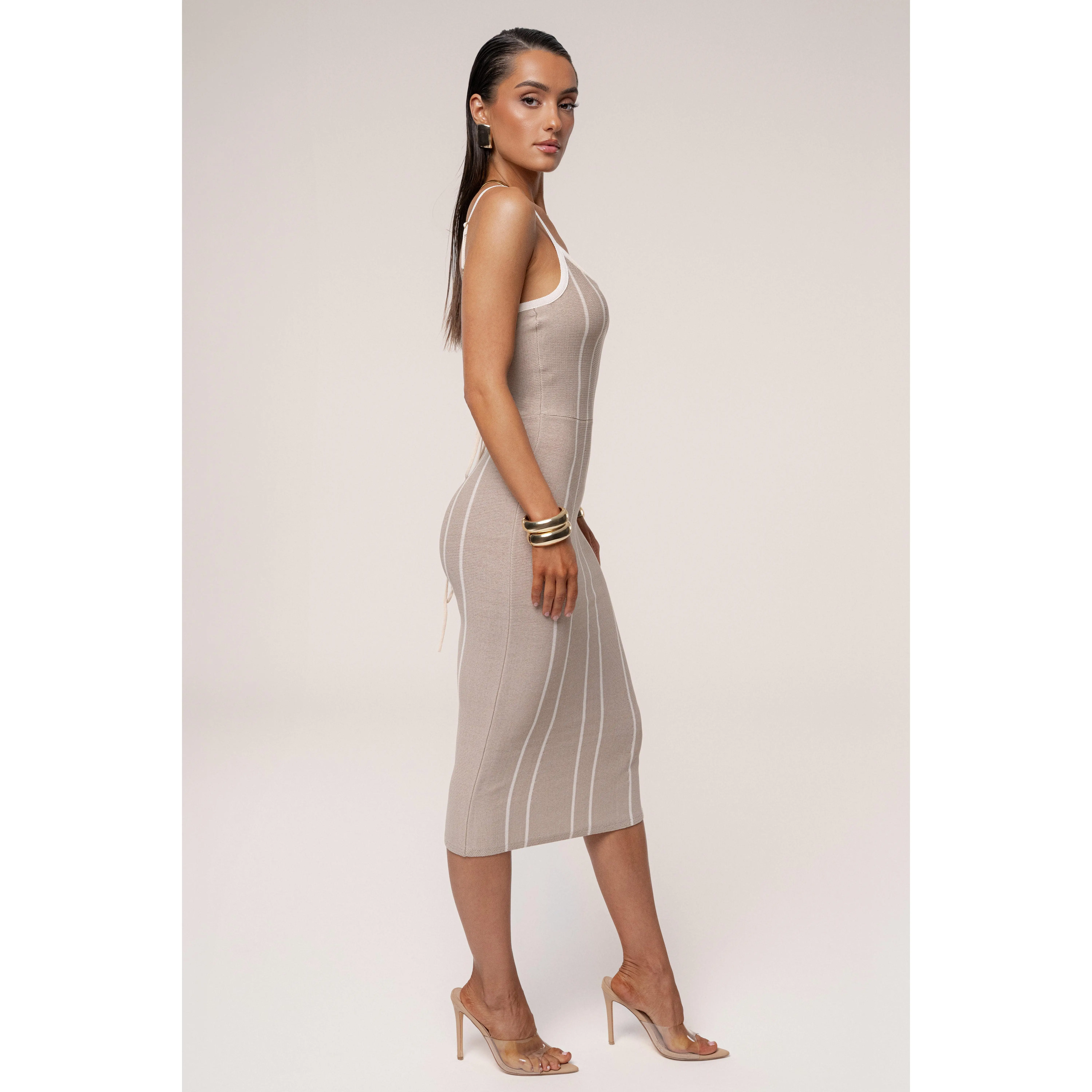 Slip into seaside sophistication with our Beige/Ivory Parallel Elegance Midi Dress. This body-hugging midi dress features vertical white stripes that elongate the silhouette and create a flattering, slimming effect. It is designed with thin adjustable straps and a lace-up back detail, so it offers both customization and charm. Crafted from a soft, stretchy rib-knit fabric, it contours your curves while ensuring all-day comfort. Stretchy. Single-lined.
