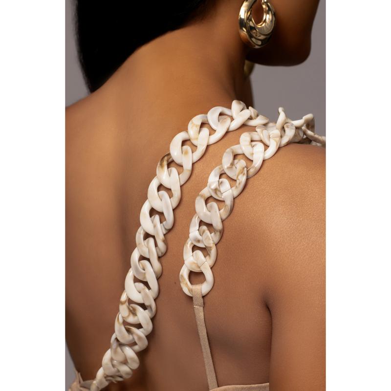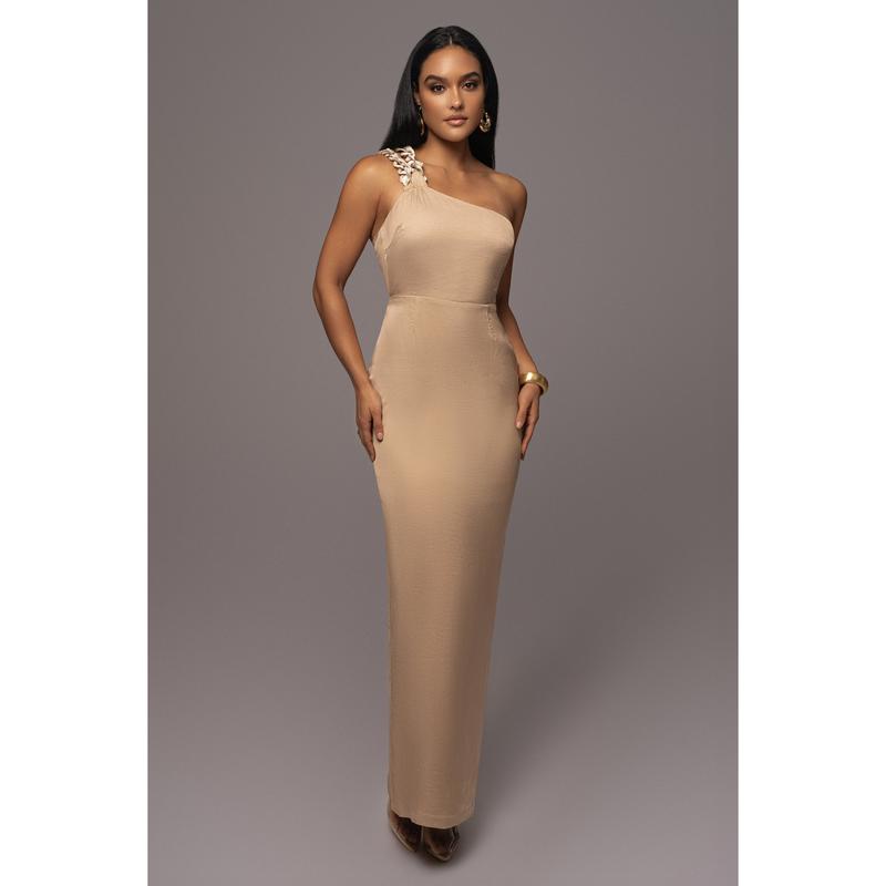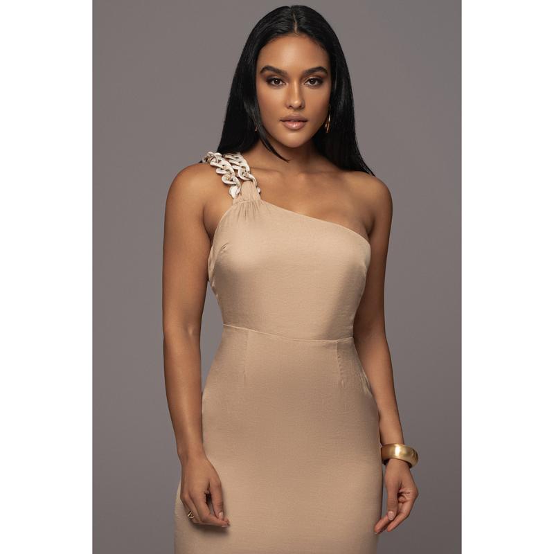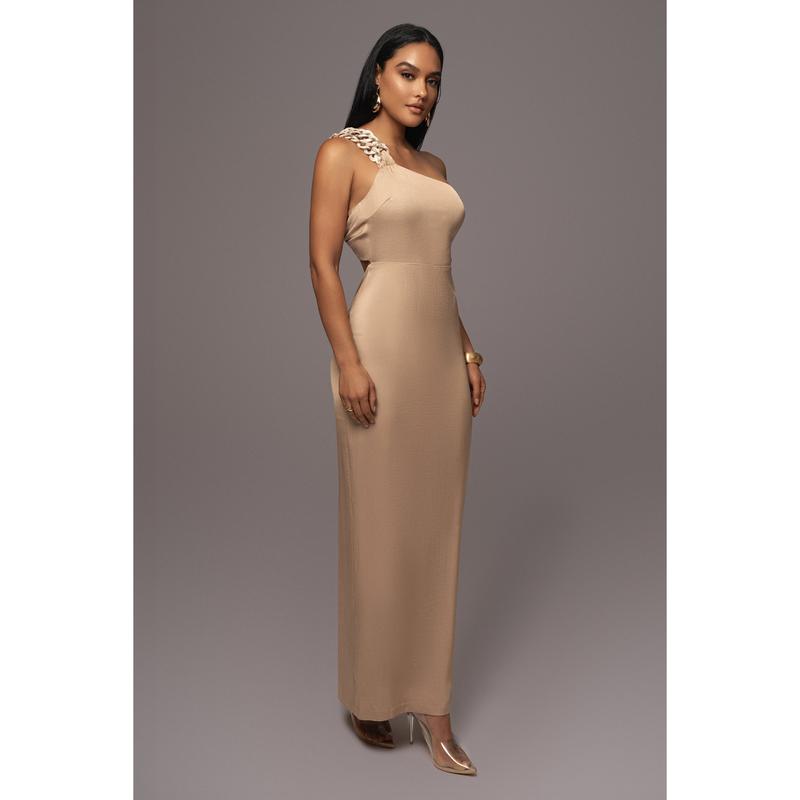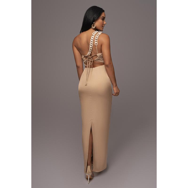 Step into summer elegance with our Beige Luxury Living Maxi Dress. This event-ready dress showcases a one-shoulder design with elegant acrylic chain straps and stylish back ties. Complete with a hidden back zipper closure and a back-slit hem. Medium stretch. Lined interior.