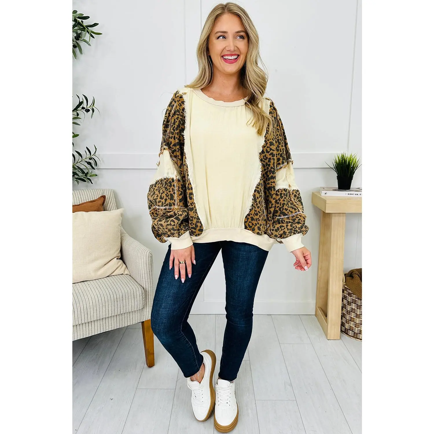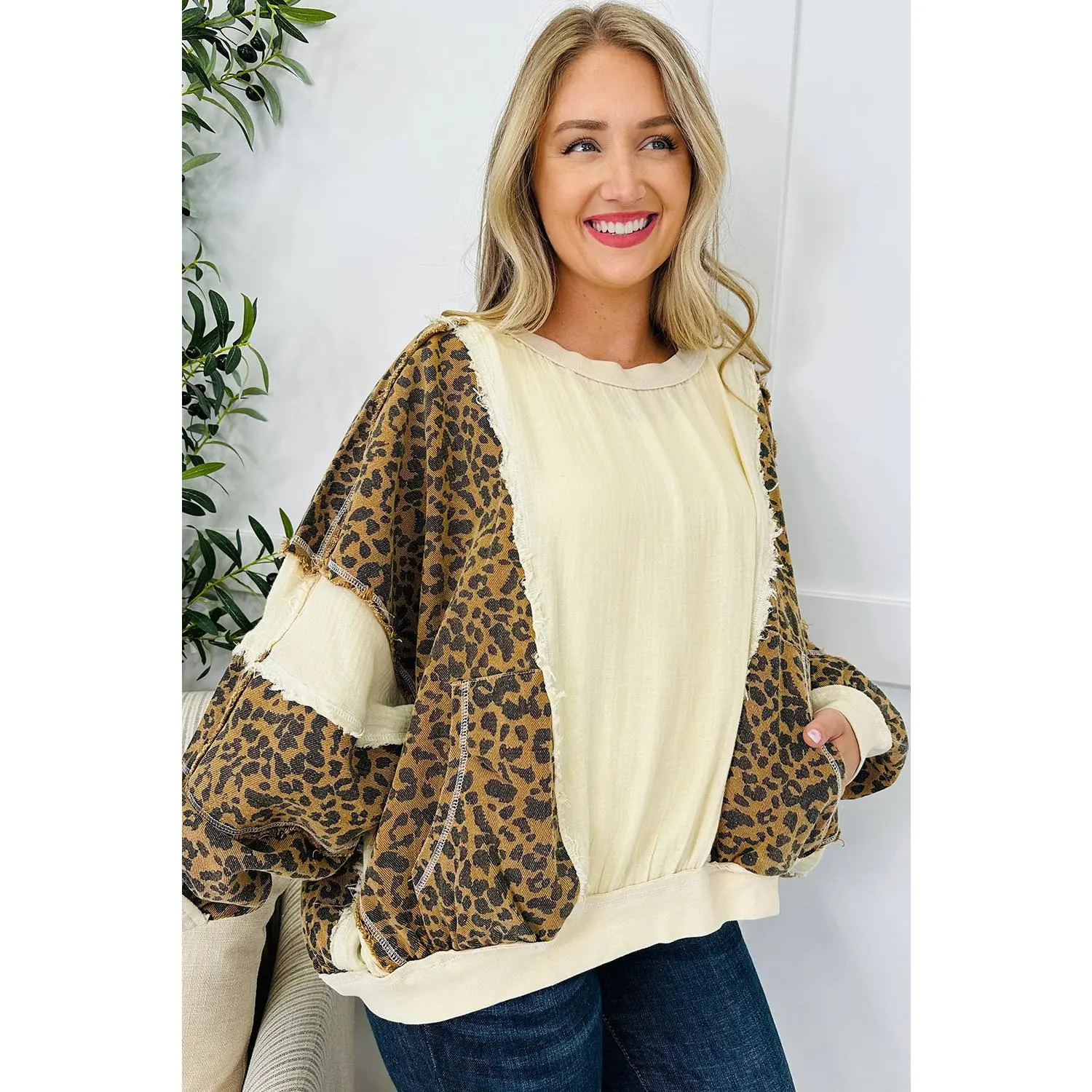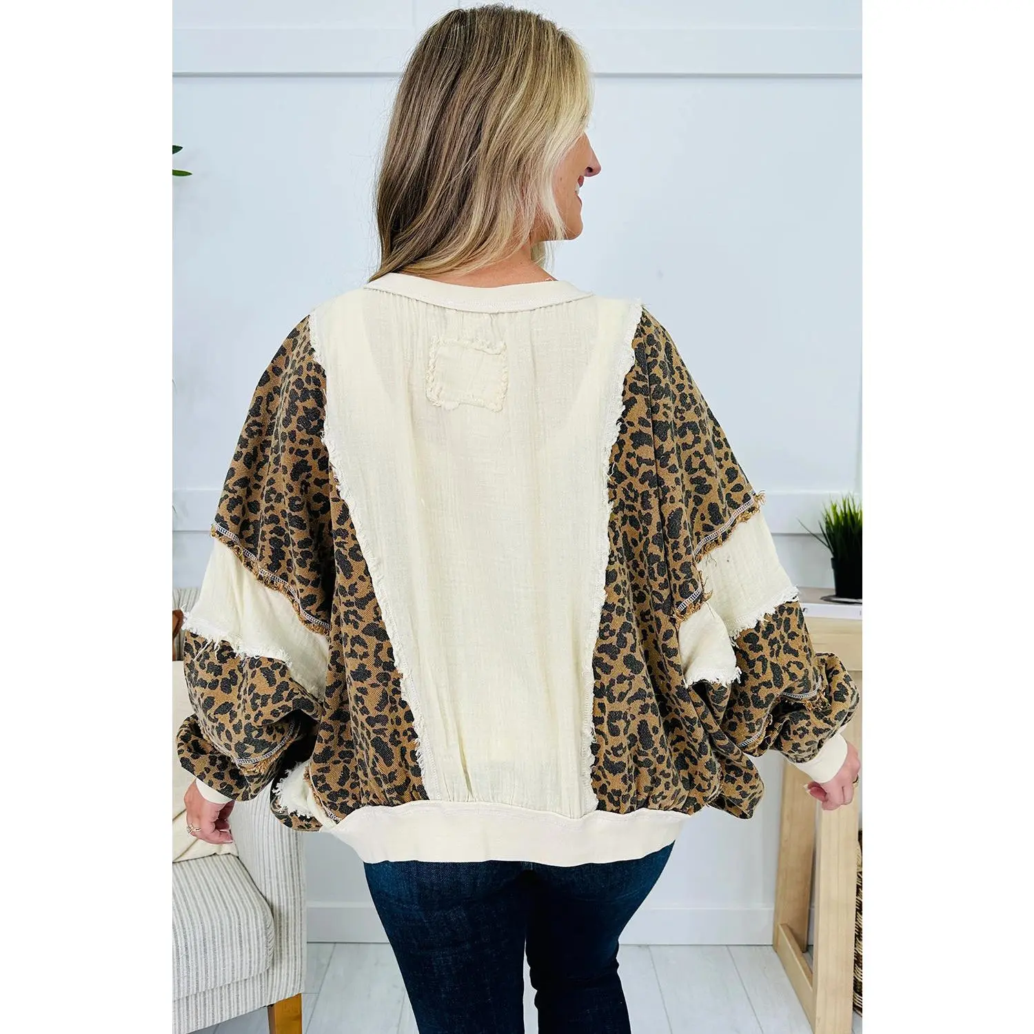 Beige Raw Seam Color Block Leopard Patchwork Baggy Long Sleeve Top