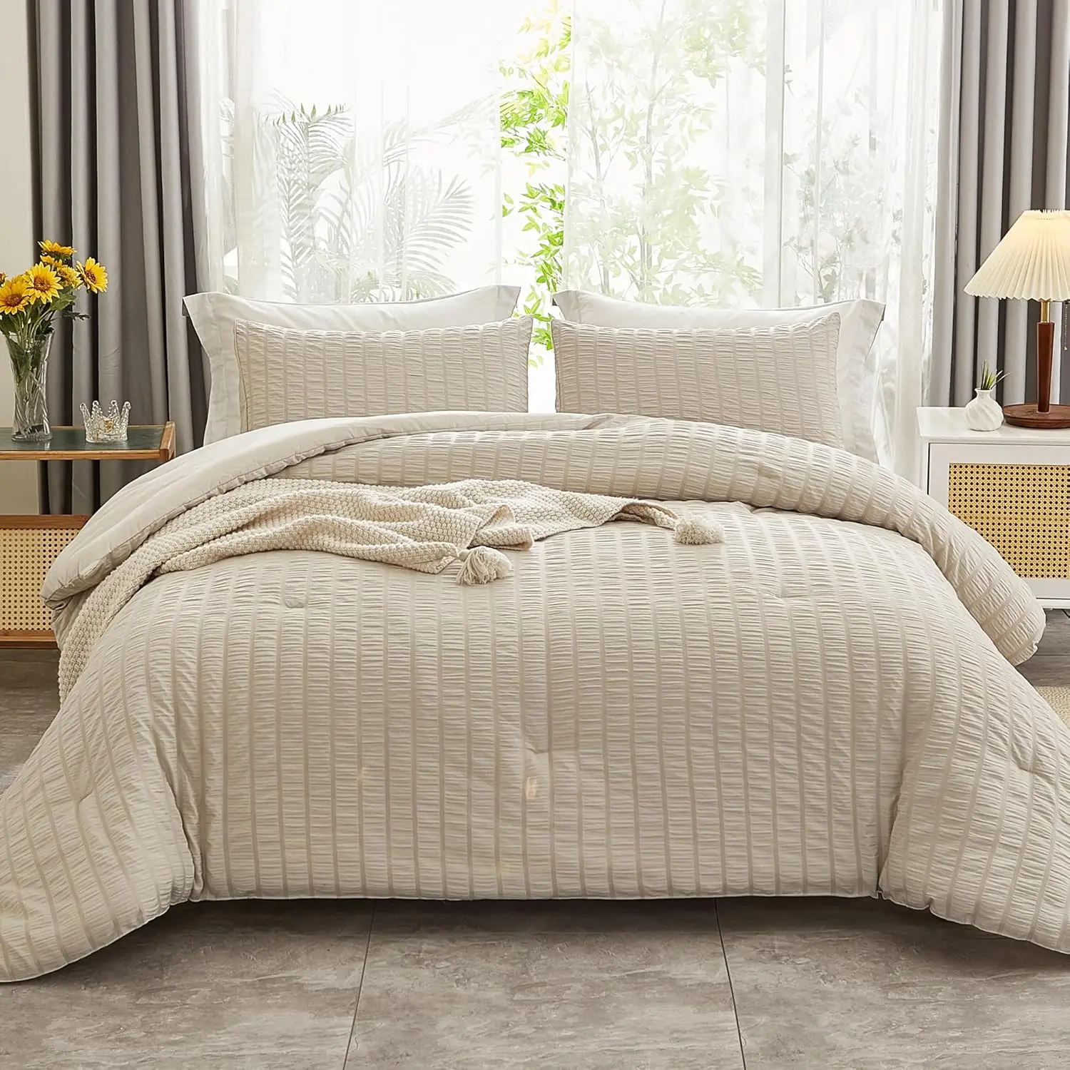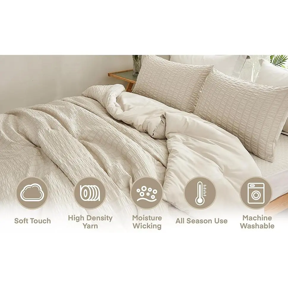 Chic Seersucker Design: Are you tired of smooth, plain comforter sets without any design?This delicate and beautiful seersucker texture is simple and fashionable, and you will fill in love with the pattern at first sight.Comfortable and Soft: AveLom Beige comforter set is made of 100% washed microfiber.Extremely soft material with 300 GSM filling keeps you warm and cozy for all seasons.40% more durable and breathable than ordinary materials.Lightweight and Fluffy: The AveLom queen size comforter will not put downward pressure on your body.You will totally melt in it and feel like sleeping on a cloud.The well-finished fabric material provides smooth and comfortable touching.Easy Care and Pet Friendly: Machine washable in the gentle cycle with cold water separately.Air dry or tumble dry on low heat.Please do not bleach.Our lightweight bed comforter set doesn't attract your pet hair.Holding up to dog/cat paws and dog/cat hair brushes off easily.Size & Measurement: AveLom seersucker comforter set queen size includes 1 Comforter (90x90 inches) and 2 Pillowcases (20x26 inches). The comforter set can be used as a duvet insert or as a stand-alone comforter.
