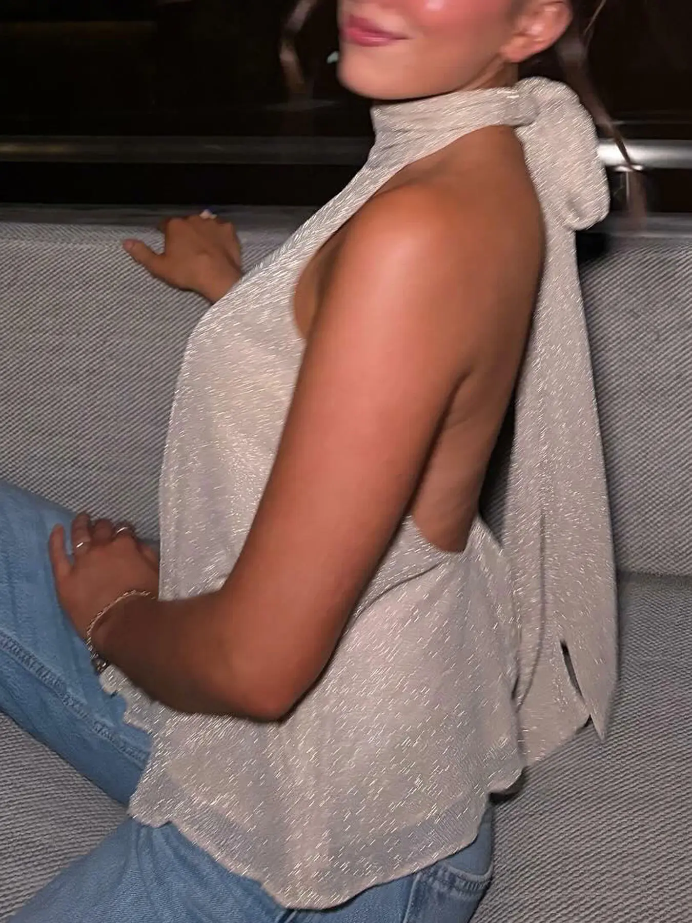 Beige Top With Scarf Detail Unique Draped Scarf - Neck Sleeveless Blouse Layered Women's Piece Metallic Thread Tank Top Resort Vests Elegant Spaghetti Strap