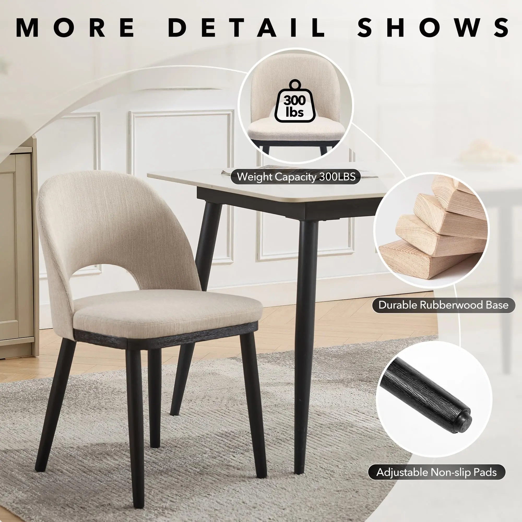 【Durability & Strength】Experience unmatched durability with our dining chairs, crafted from rubberwood frames and reinforced legs. Each chair is rigorously tested to support up to 300 lbs, ensuring steadfast stability for daily family use and gatherings. The integrated anti-scratch footpads protect your floors while adding wobble-free security.