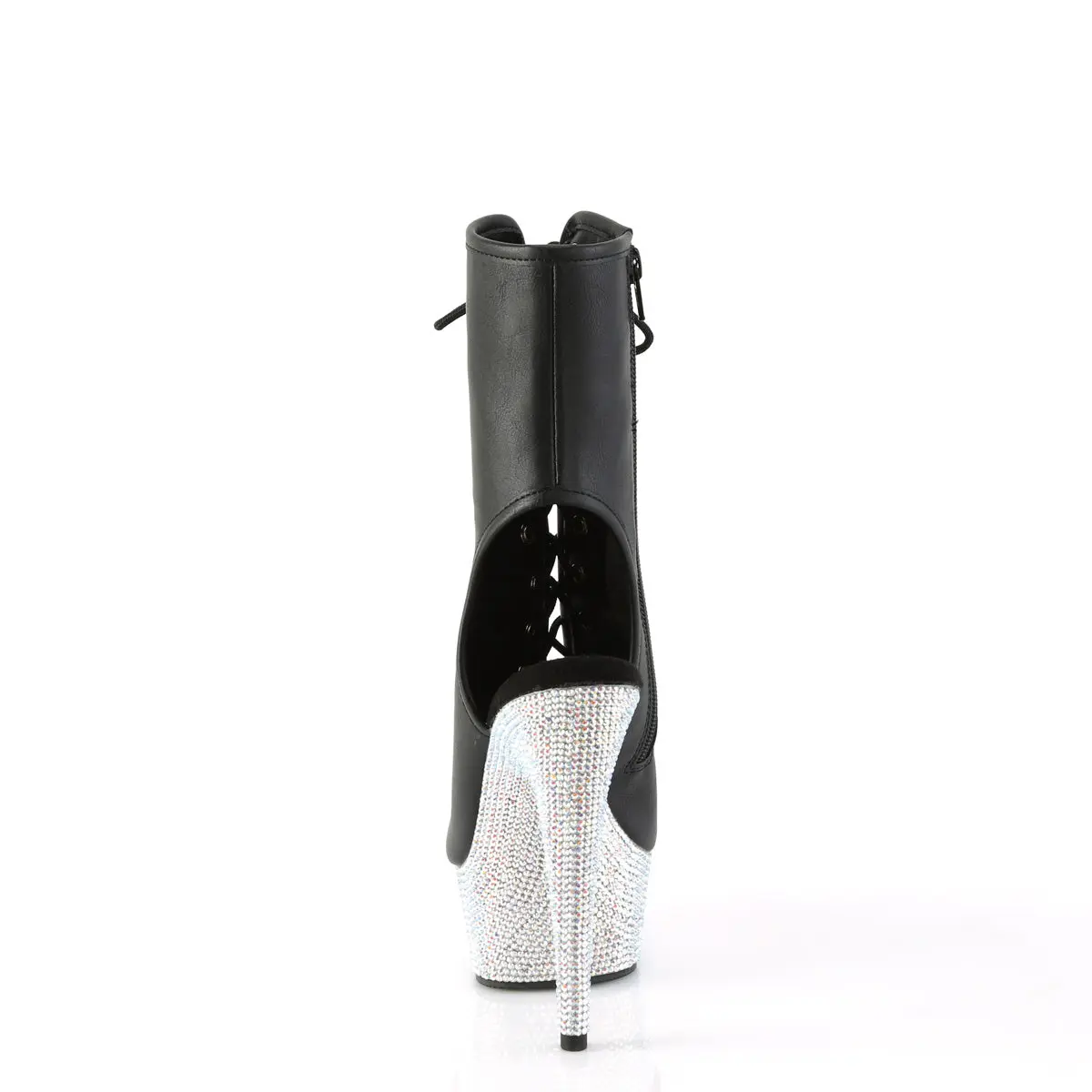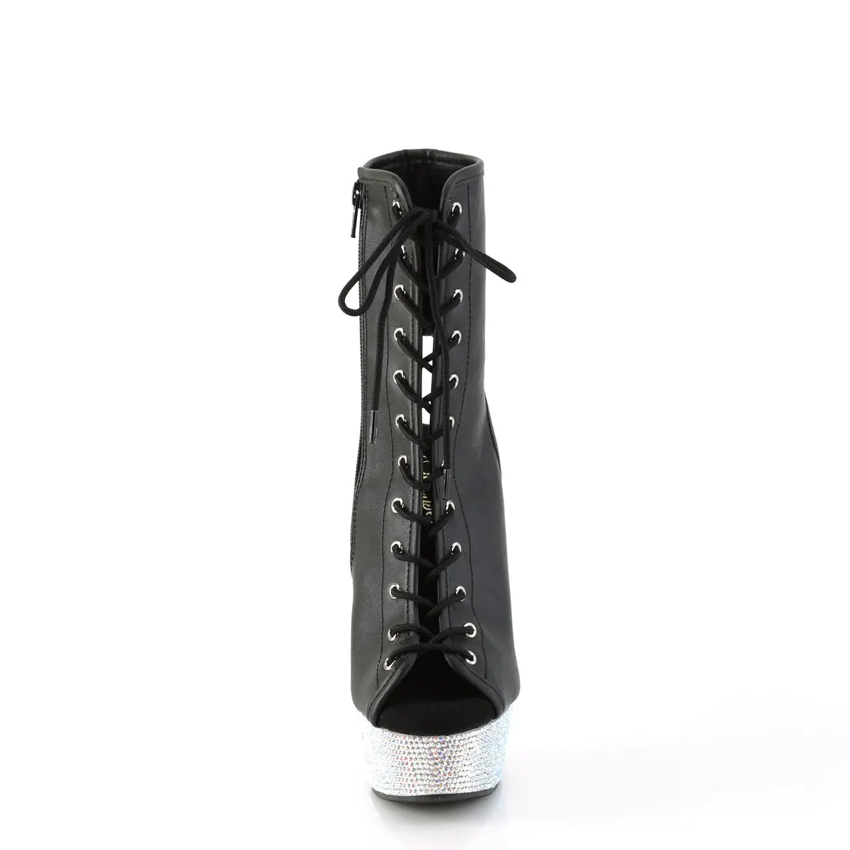 Shine like a star in the Bejeweled-1016-6 Ankle Boots. Elevating you with a 6-inch heel and a 1 3/4-inch platform, these boots are nothing short of spectacular. The black vegan leather surface is perfectly complemented by an all-over rhinestone-encrusted platform bottom, making these boots a true masterpiece. The open toe and heel design, combined with a chic lace-up front, adds a playful yet edgy vibe. Featuring an inner side zip closure, these boots are a must-have for those who love to stand out.