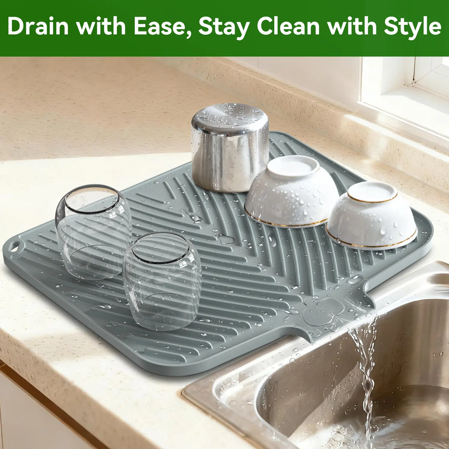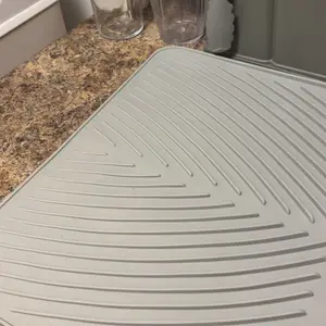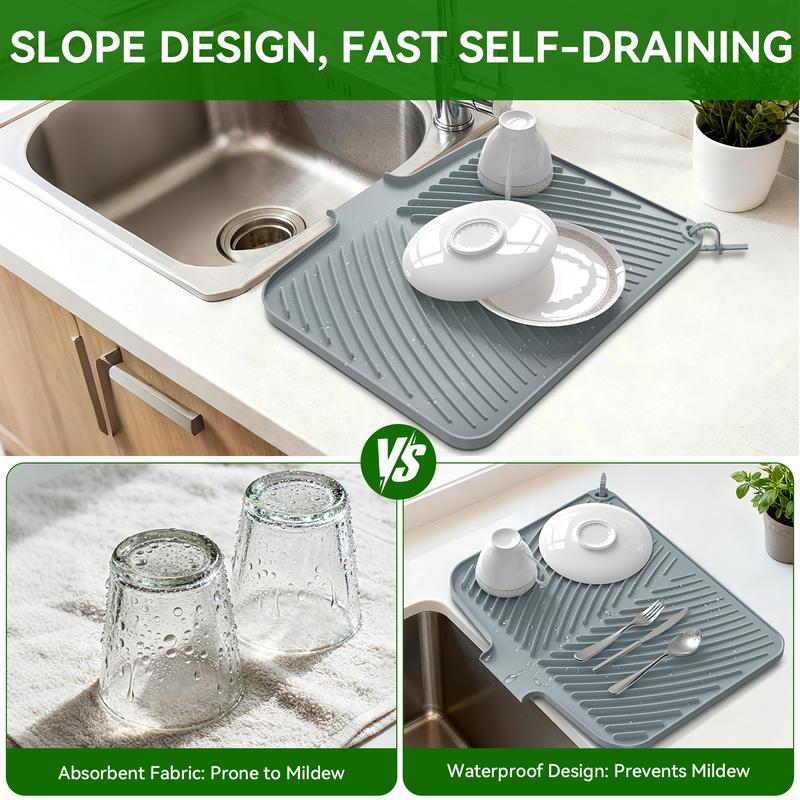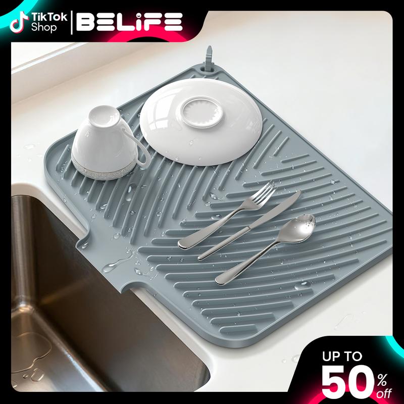 Quick Drying Mat: BELIFE dish drying mat measures 16.9" x 14.6", where washed dishes can be placed for air drying. The folding, raised and innovative design of the quick dry dish mat allows air to circulate under the dishes,and features unique diagonal ridges to easily remove moisture, and a specially designed rim that lets water drain directly into the sink. This keeps your countertops dry and clean, and says goodbye to wet countertops.