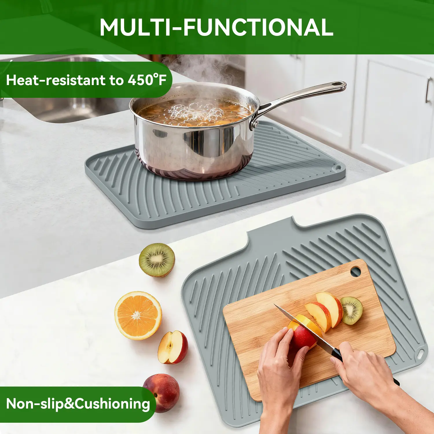 Multifunctional mat: TIKNIK multi usage drain pad can not only dry dishes on the kitchen countertop or beside the sink, but also can be used as a dish rack mat, refrigerator liner, heat-resistant mat, baking mat, non-slip mat for cutting boards, coffee pot mat, heat-resistant tripod for hot pots and pans, etc., so that you can have a different wonderful experience in different scenes.
