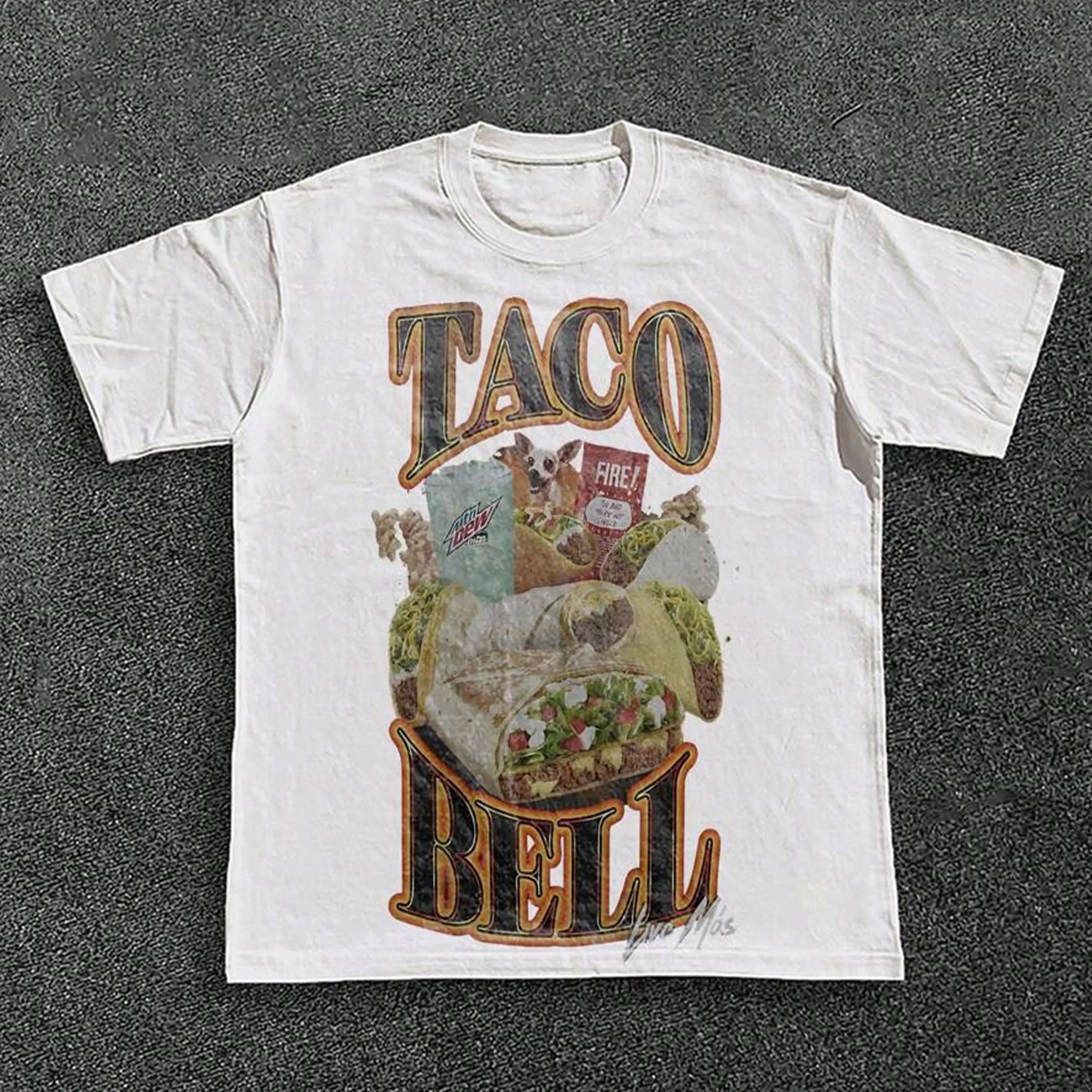 Taco Bell Fire Sauce And Mountain Dew Collage Graphic Print Casual Graphic Print Short Sleeve Crew Neck T-Shirt Cool Grandpa Grandma Nickname Anime Acid Washed Vintage Retro Heart Hands USA Mexico Flag Unisex boxy fit shirt gorlock destroyer   star labs