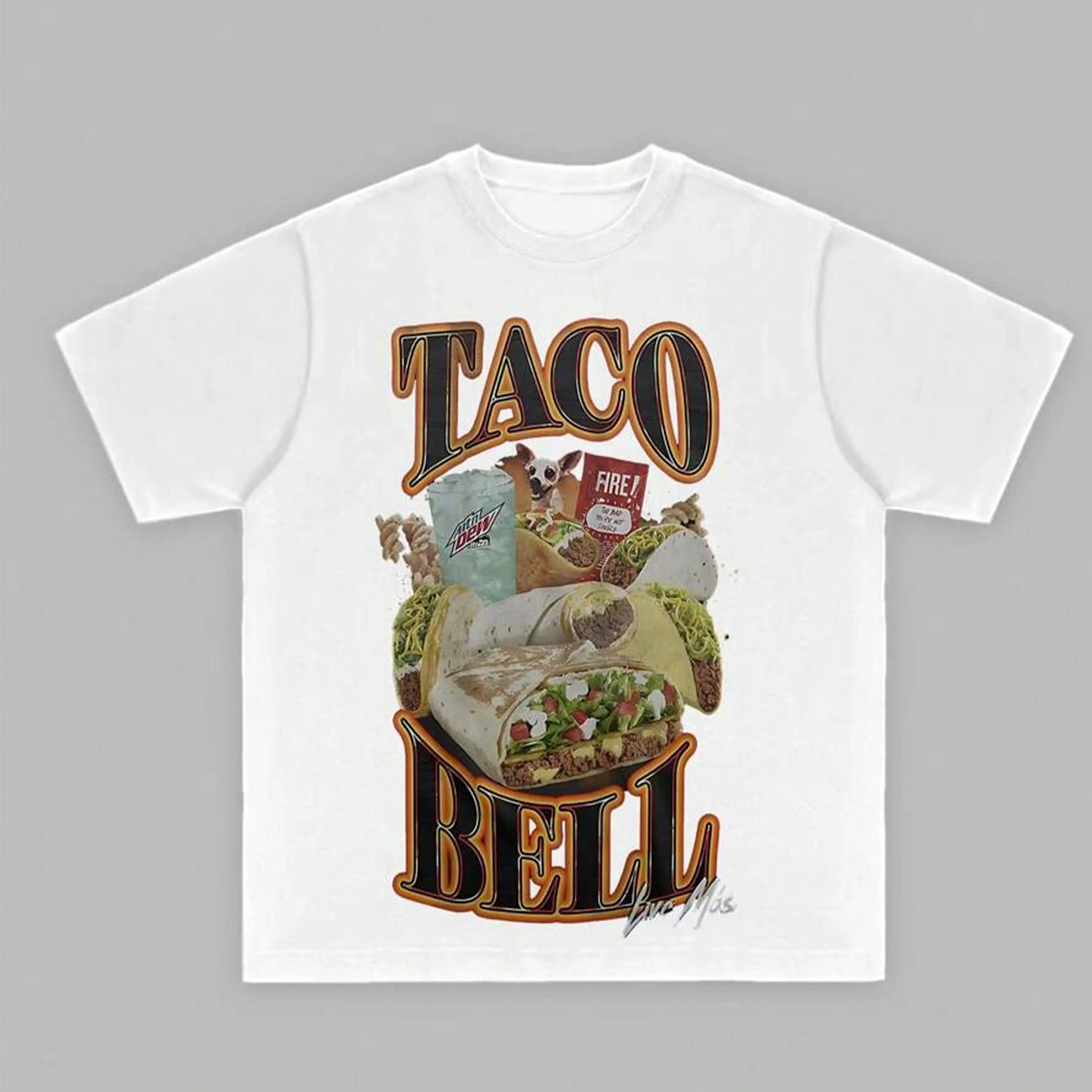 5. Taco Bell Fire Sauce And Mountain Dew Collage Graphic Print Casual Graphic Print Short Sleeve Crew Neck T-Shirt Cool Grandpa Grandma Nickname Anime Acid Washed Vintage Retro Heart Hands USA Mexico Flag Unisex boxy fit shirt gorlock destroyer star labs