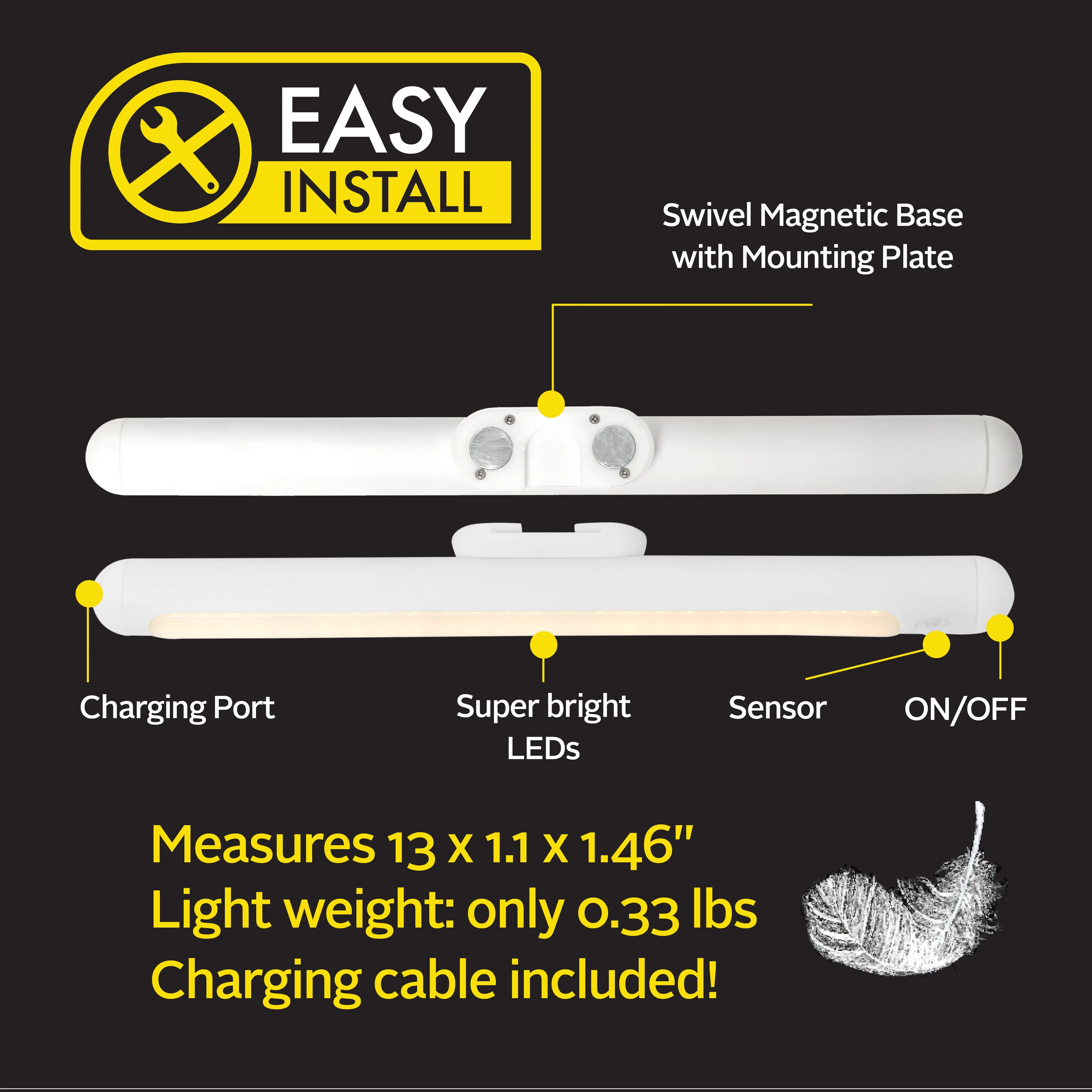Brighten closets, cabinets, and storage spaces with the Bell + Howell Bionic Under Cabinet Light, a sleek and convenient lighting solution designed to eliminate dark areas and improve visibility throughout your home. Using advanced energy-efficient LED technology, this wireless light delivers clear, even illumination that makes it easier to find items and stay organized. Its battery-operated, cord-free design allows for quick installation without tools, wiring, or professional help, making it ideal for closets, kitchens, pantries, stairways, and more. With motion activation, adjustable brightness, and linkable capability, this versatile light provides reliable, customized lighting exactly where and when you need it.