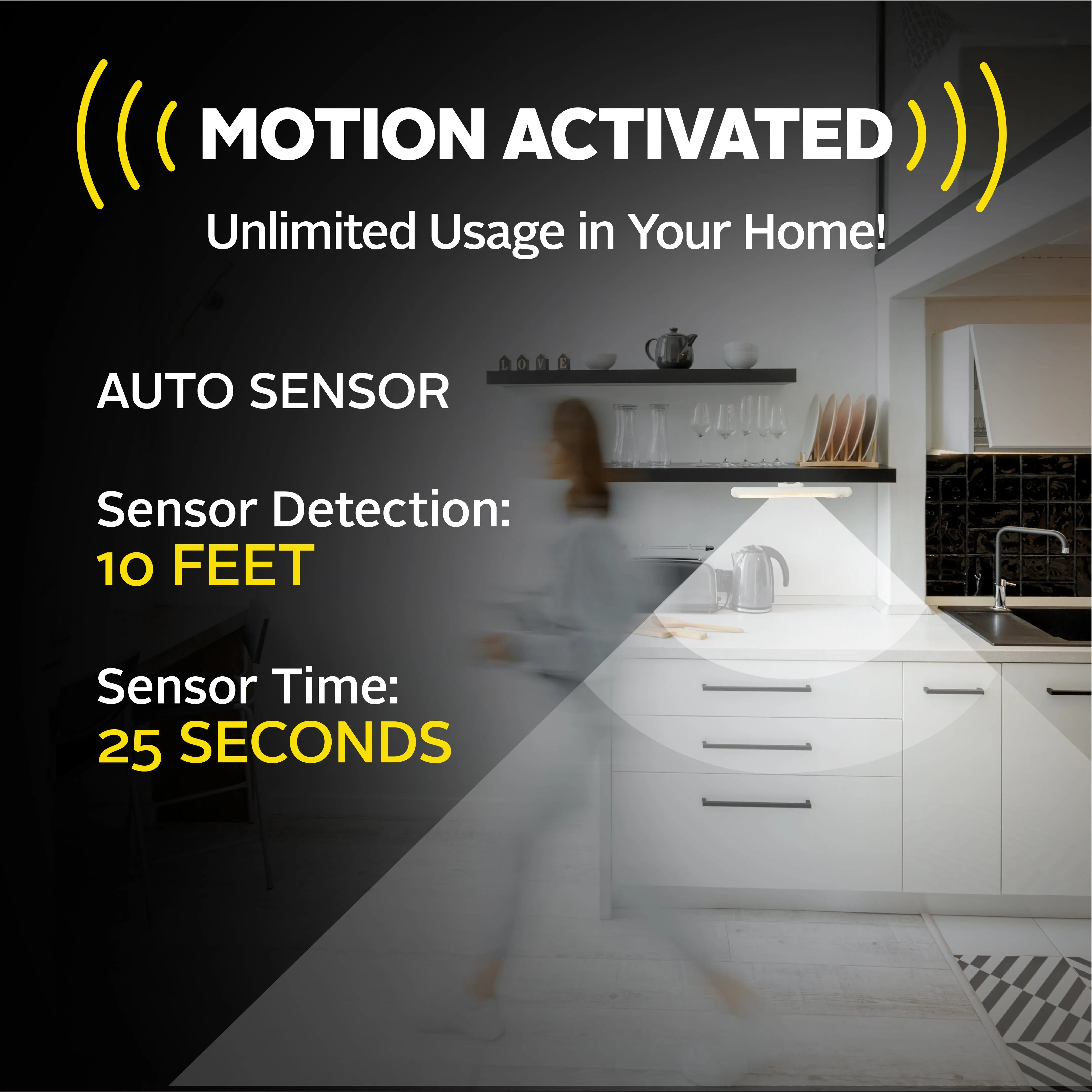 ·Motion-Activated Sensor: Automatically turns on when motion is detected from up to 10 feet away and turns off to conserve energy