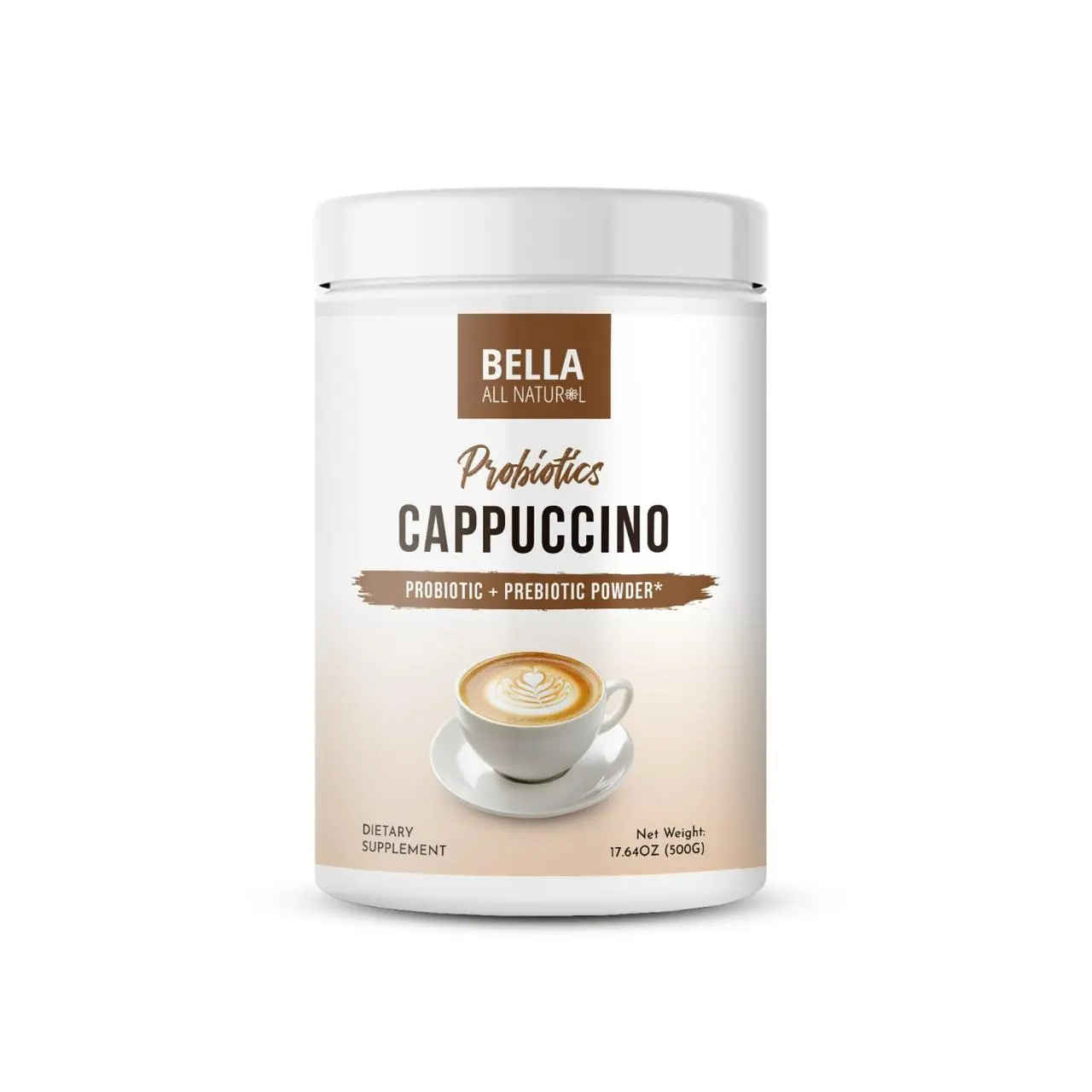 Elevate your digestion with Bella All Natural Probiotics Cappuccino. This 500g powder combines probiotics and prebiotics for improved digestion. Perfect for adults, it's a daily beverage that supports your digestion. Drink every morning or noon for a tasty, beneficial drink.
