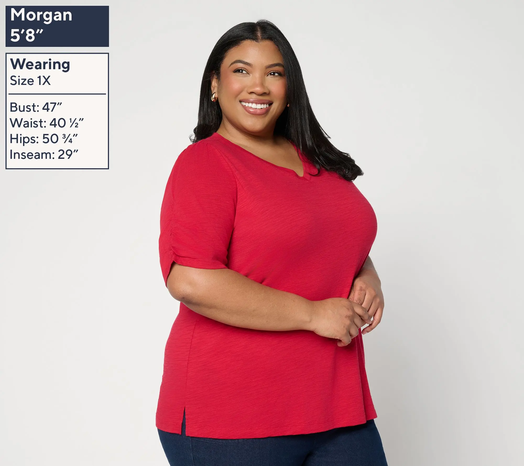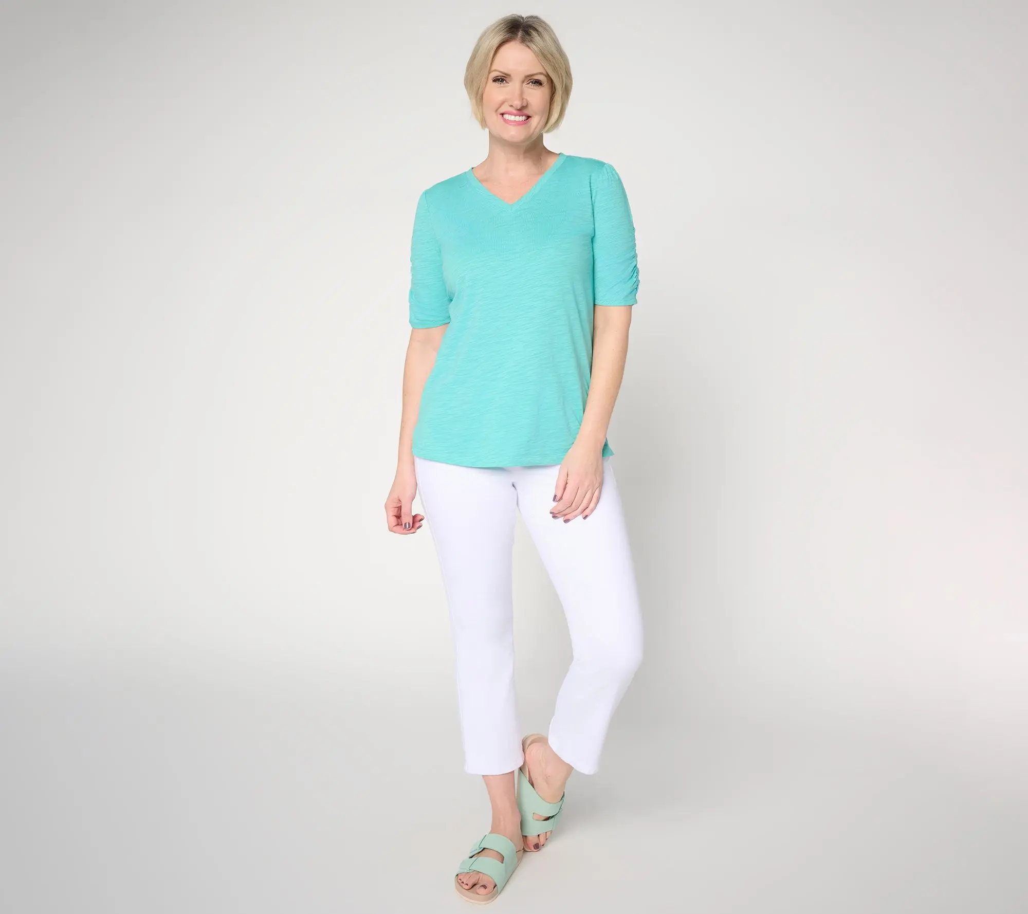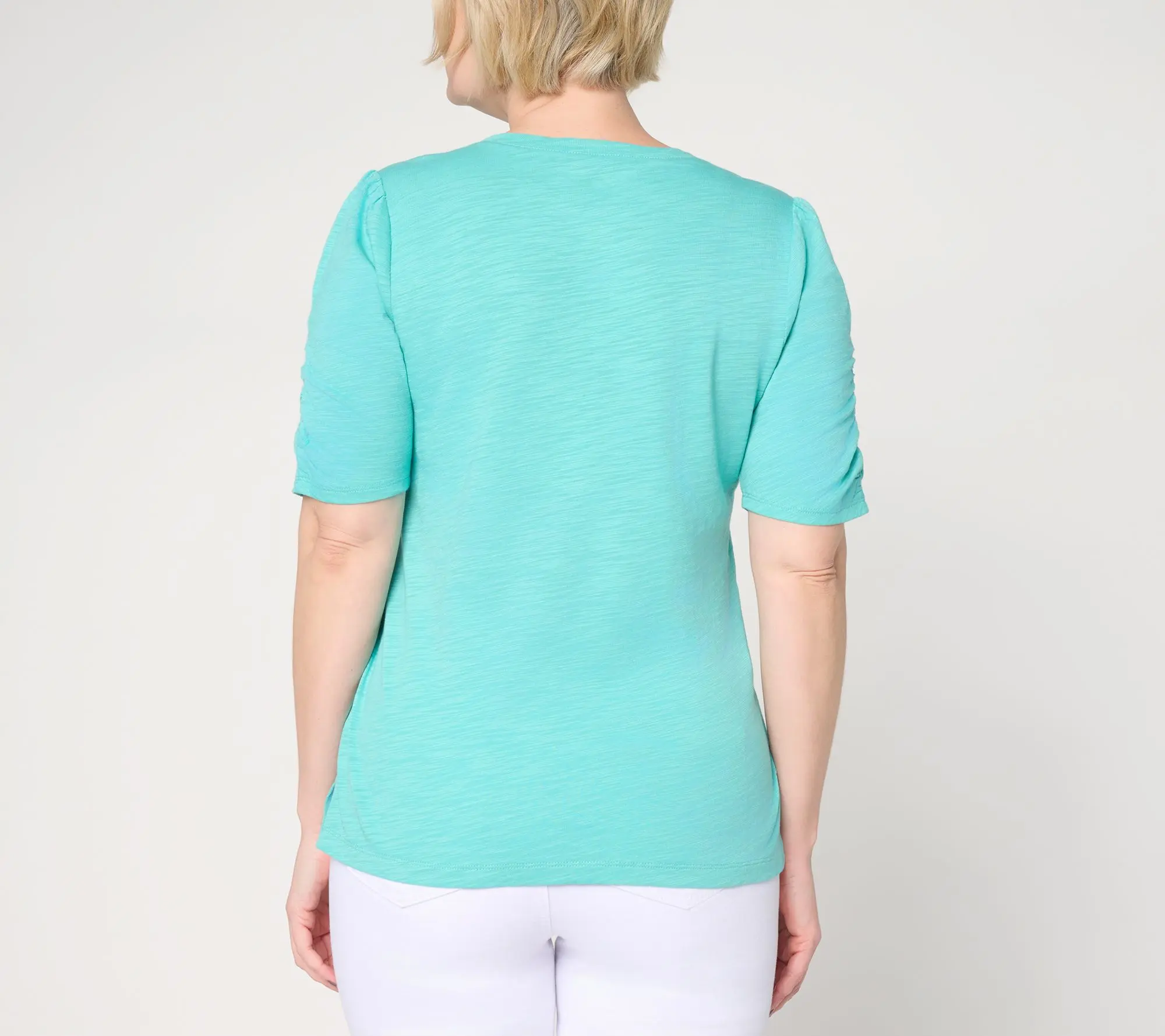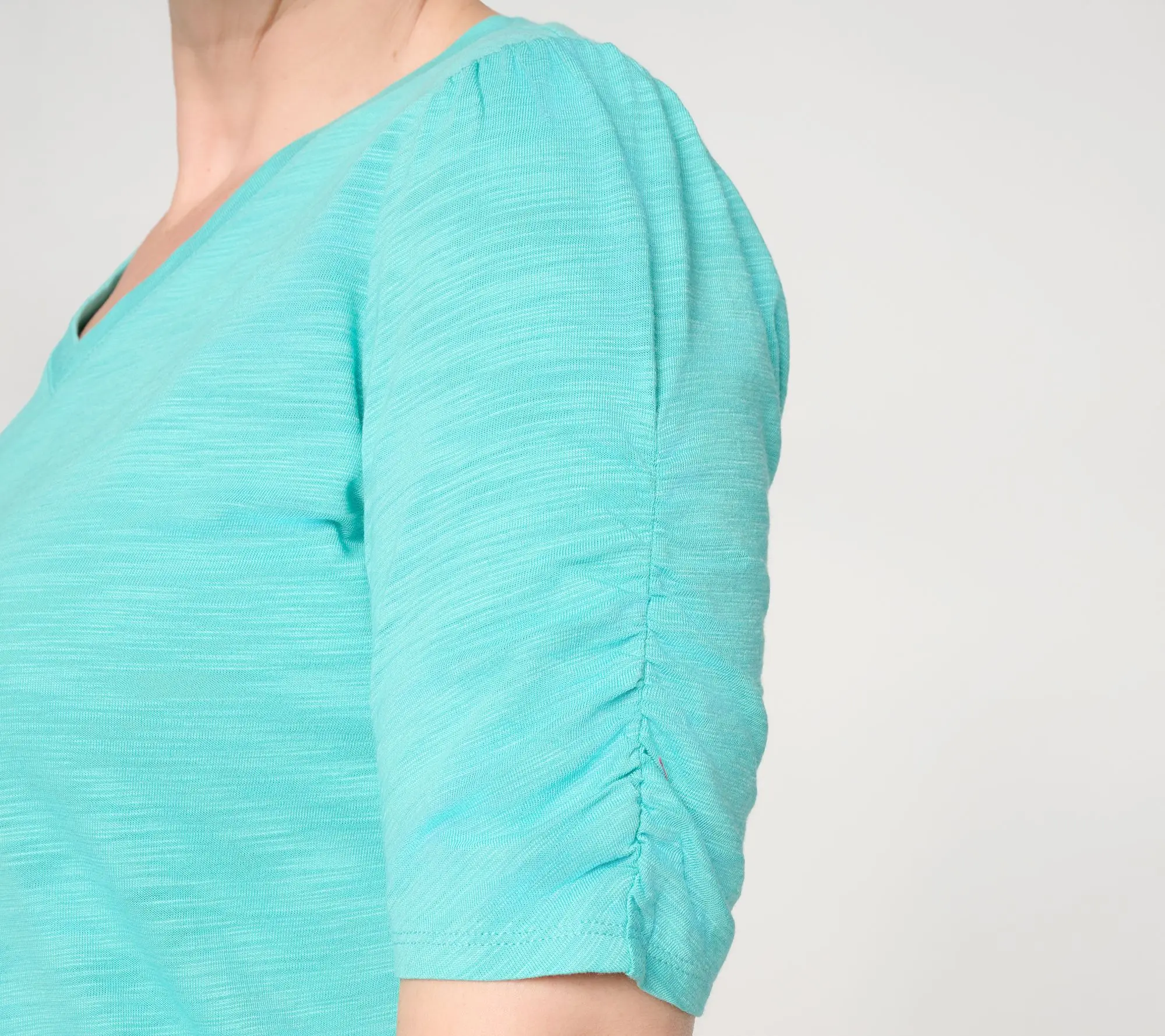 Belle by Kim Gravel Slub Knit Ruched Elbow V Neck Top. Elbow Sleeve V Neck Knit Top. Ruched Sleeve. Straight hem with side slits. Semi-fitted: follows the lines of the body with added wearing ease. Regular missy length : 26.5" - 28.625", Regular plus length : 29" -__ 32.5". Content : 60% cotton 40% modal. Care : MWCDC/WS/ONCBWN/TDL/CIIN