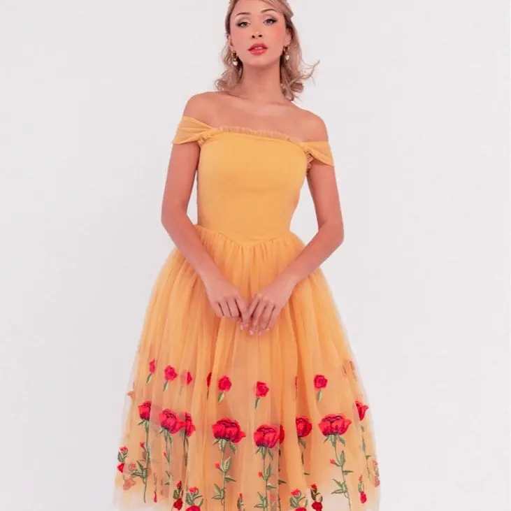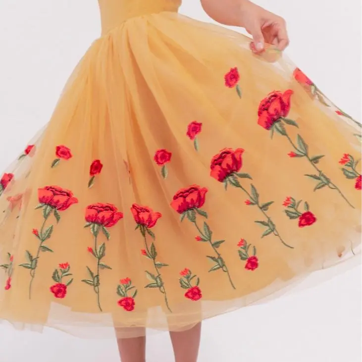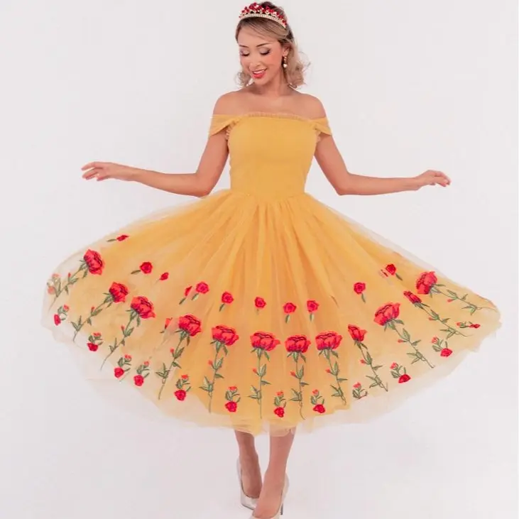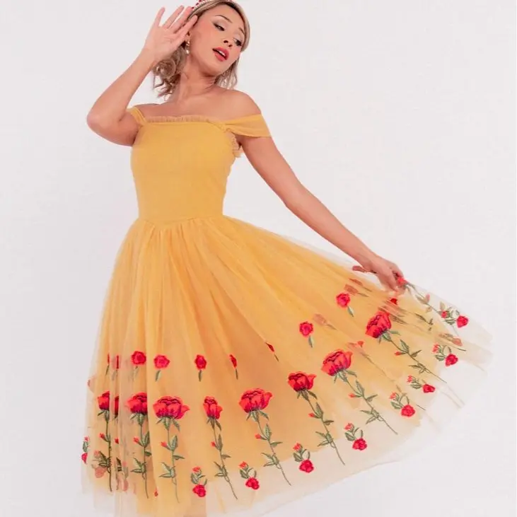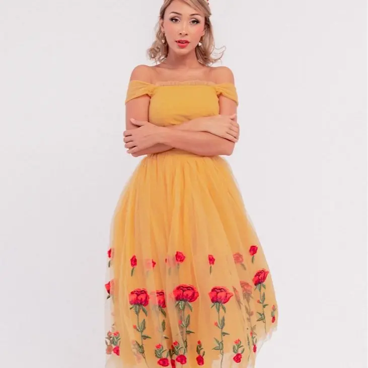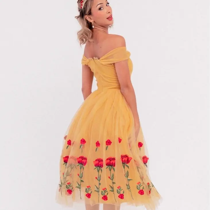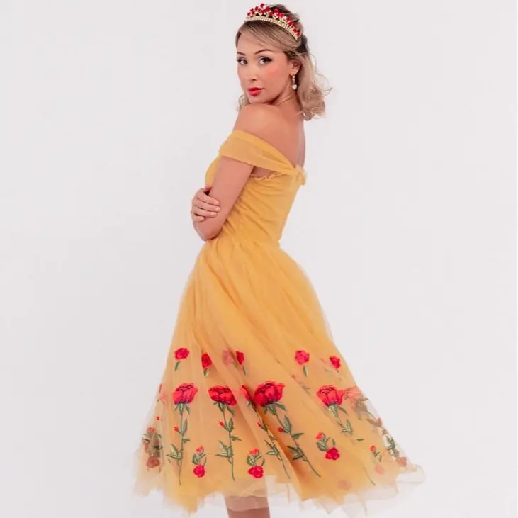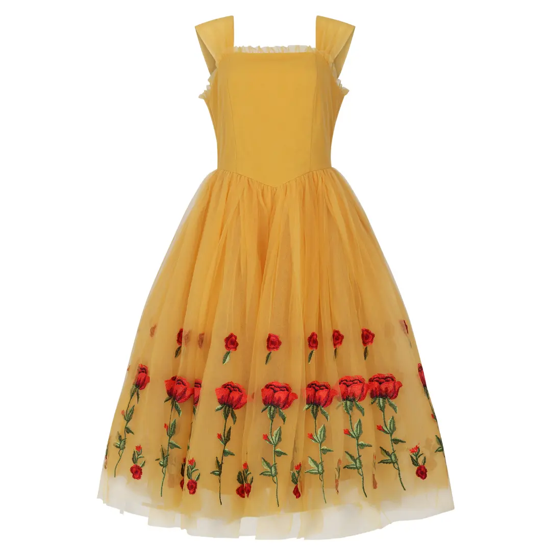 The Belle Dress is a vision of timeless beauty and fairytale charm. With its rich, golden color and delicate designs, this dress exudes the feminine grace of its beloved namesake. The skirt, adorned with intricate rose embroidery, beautifully swirls with every step, creating an enchanting silhouette. Whether attending a party or dressing up in cosplay, this dress will have you feeling like the Belle of the ball all day!