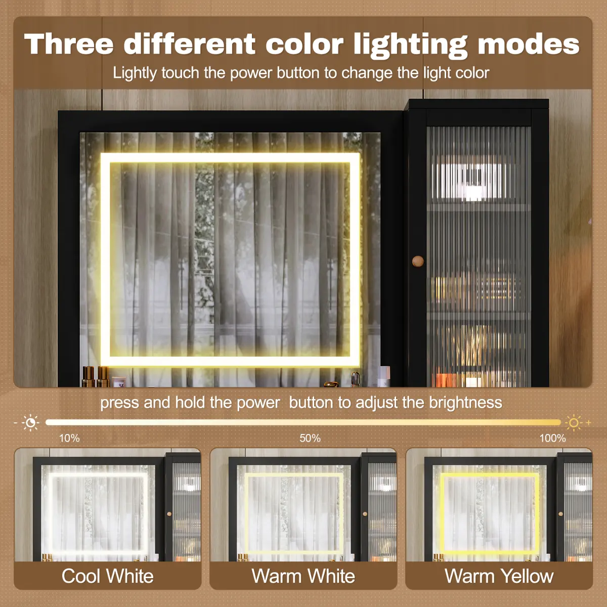·10 Hollywood Bulbs: The large square mirror is surrounded by 10 LED bulbs with 3 color settings-warm, natural, and cool white-to match any lighting condition.Whether you're getting ready for work or a night out, enjoy clear and adjustable illumination at your fingertips.