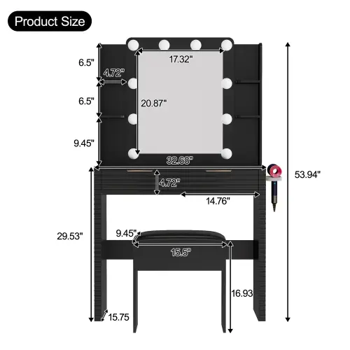 ·Durable MDF Build with Matte Black Finish: Crafted from high-quality MDF wood, this vanity table is built for daily use.Its matte black finish is both scratch-resistant and easy to maintain, combining durability with sophisticated style.